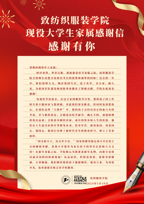 一直以来,太阳成集团tyc9728十分重视入伍学生在部队的发展,时刻关心服役学生的家庭状况,学院对目前在役学生9位学生家属进行了电话慰问,关心关爱其生活和家庭情况,在春节来临之际向入伍学生家属寄出慰问信和节日慰问品,送去学校和学院的温暖和爱护,在役学生家属纷纷对学院的关心表达了衷心的感谢。