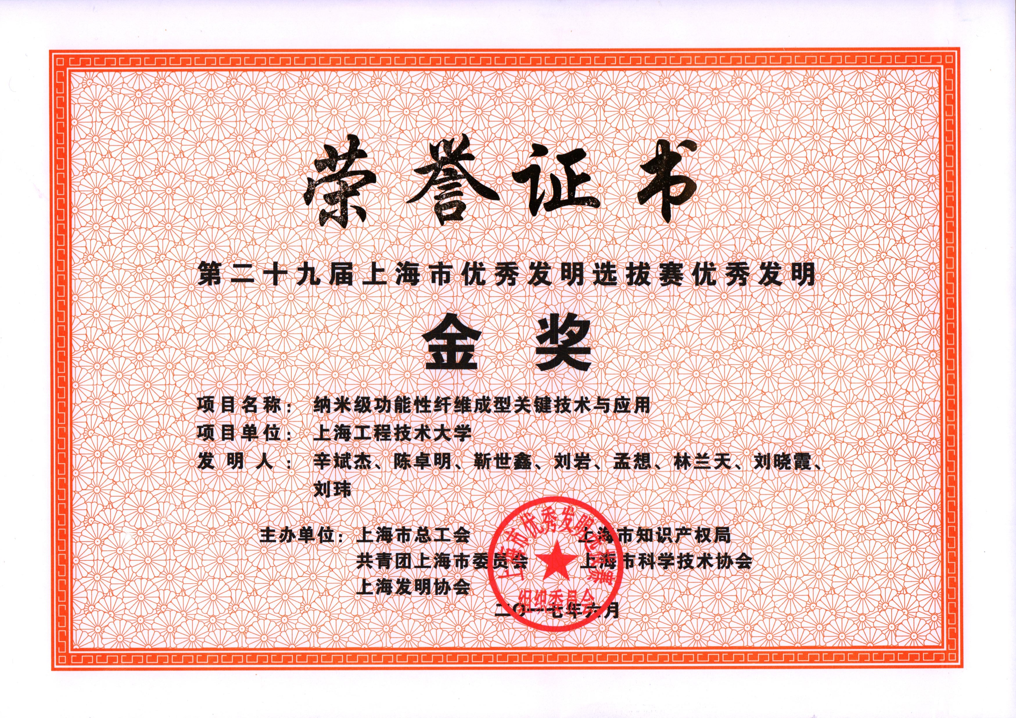 2017年6月2日,第二十九届上海市优秀发明选拔赛颁奖典礼上传来喜讯,服装学院“特种纺织品技术研究与应用”科研团队辛斌杰教授主持的项目“纳米级功能性纤维成型关键技术及应用”获得金奖。