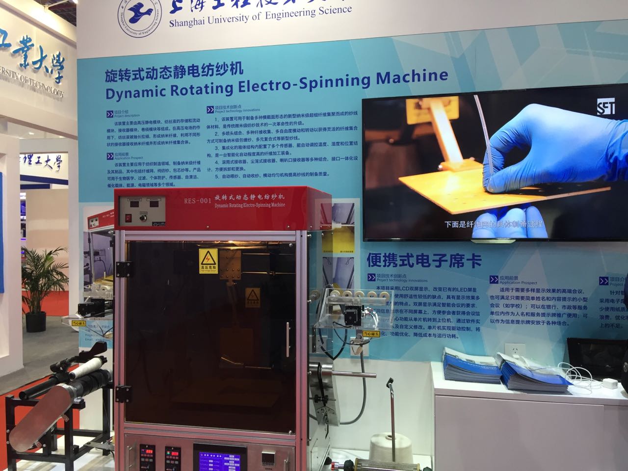 该项目采用静电纺丝法将高聚物溶液在高压电场中一步直接制得纳米纤维,利用不同形状的接收装置收集纳米纤维并形成纳米纤维集合体,可用于制备多种横截面形态的新型纳米级超细纤维集聚而成的柔性纱线材料,是传统微米级纺纱技术的创新性升级。课题组研制的第一代旋转式动态静电纺纱机主要应用于纤维制造领域,可根据不同的工艺需求制备纳米级纤维及其制品,包括纤维网、纯纺纱、包芯纱等。