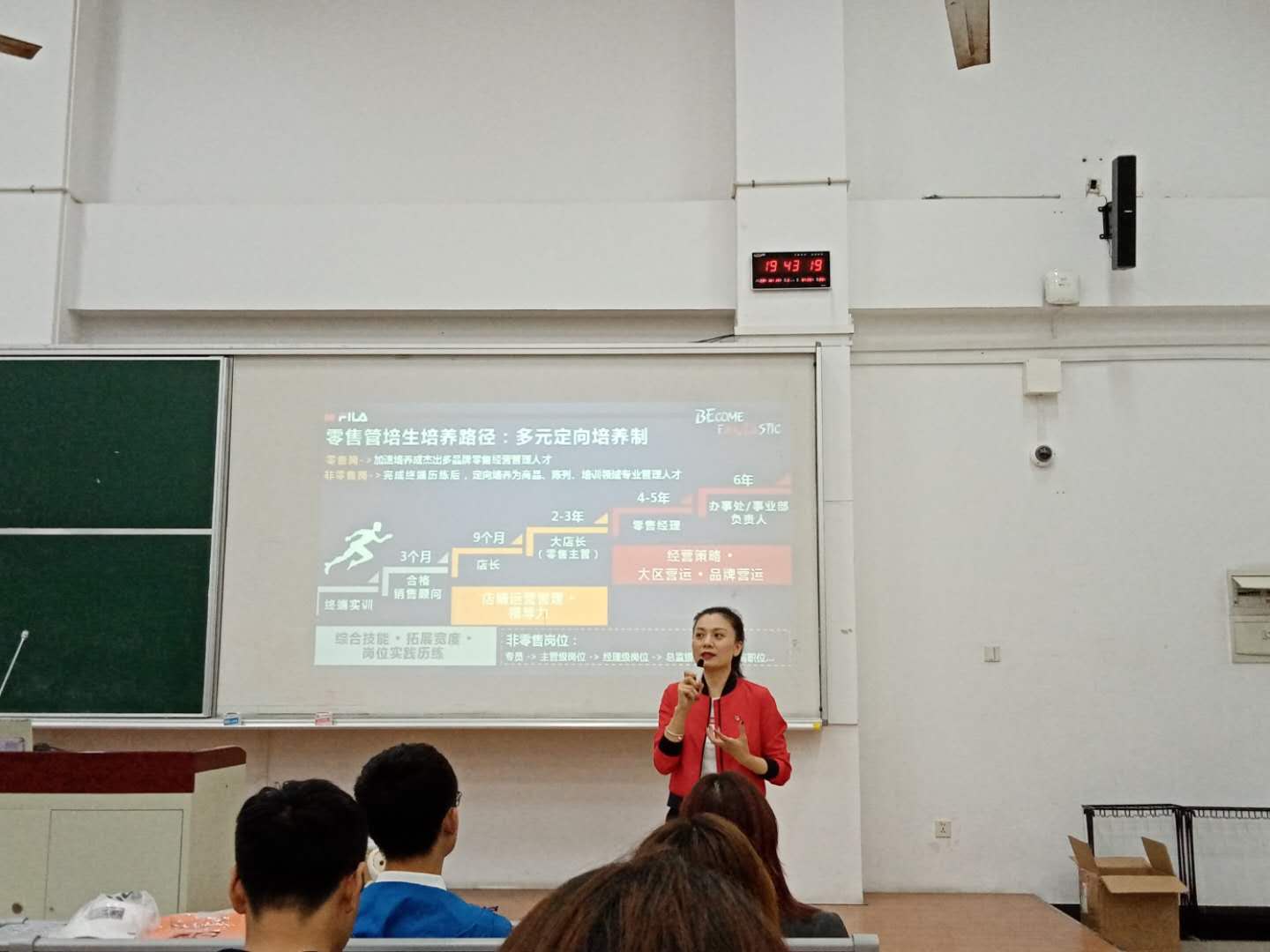 左莉女士围绕“零售管培生培养路径:多元定向培养制”主题展开,从终端实训起步,深入介绍了合格销售顾问,店长、大店长,零售经理、集团办事处或事业部负责人的成长序列。左女士还从顾问期间的综合技能、拓展宽度、岗位实践历练,店长期间的店铺运营领导力,零售经理、事业部负责人期间的经营策略、大区营运、品牌营运,围绕管培生成长路径上每个阶段的能力匹配展开详细分析探讨。左莉女士带领同学分析了今年服装行业特殊就业形势,并结合自身从高校毕业后的求职经历,带着实情实感和在行业打拼的点点滴滴,建议同学们立足自身实际,科学进行职业规划,把握就业机会,认真开展应聘准备,重视第一份工作的选择,要有打拼精神和敬业精神,用科学规划和能力提升赢得职场未来。