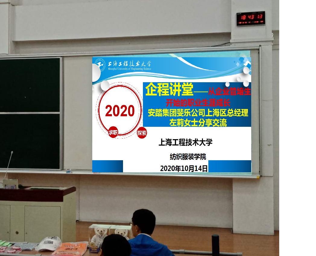 此外,学院2020届服装设计与工程专业毕业校友汪平,今年就职于斐乐公司上海区零售终端门店。汪平参加工作后勤恳努力,取得了部门销售冠军的突出业绩。汪平在交流现场与同学们分享了自身入职斐乐的经历和工作收获,给同学们很大鼓舞和激励。