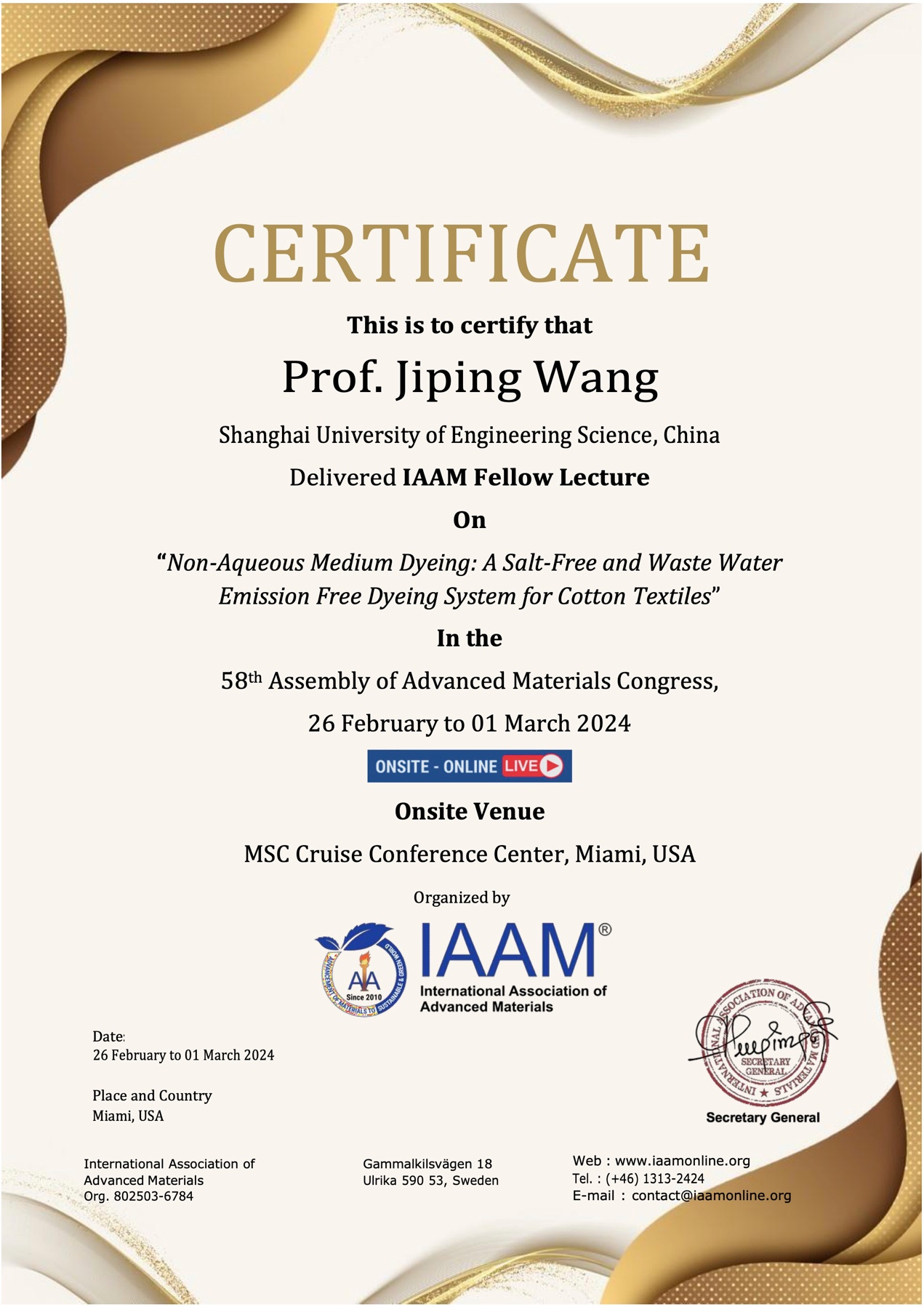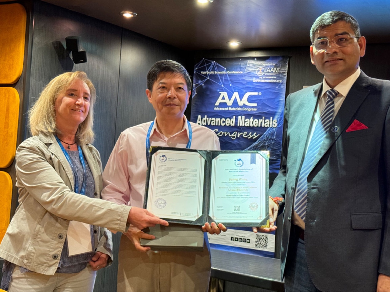 近日,太阳成集团tyc9728教授、上海纺织化学清洁生产工程技术研究中心主任王际平当选国际先进材料协会(International Association of Advanced Materials,IAAM)会士(FIAAM),以表彰其在“绿色和可持续发展技术”领域做出的突出贡献。王际平教授受邀参加了在美国迈阿密举行的第58届先进材料大会(American Advanced Materials Congress),并担任复合和聚合物材料科学分会场主席,作了“Non-Aqueous Medium Dyeing: A Salt- Free and Waste Water Emission Free Dyeing System for Cotton Textiles”主题报告,着重介绍了研究团队在纺织品绿色可持续发展和无盐非水介质染色技术方面的系统工作。