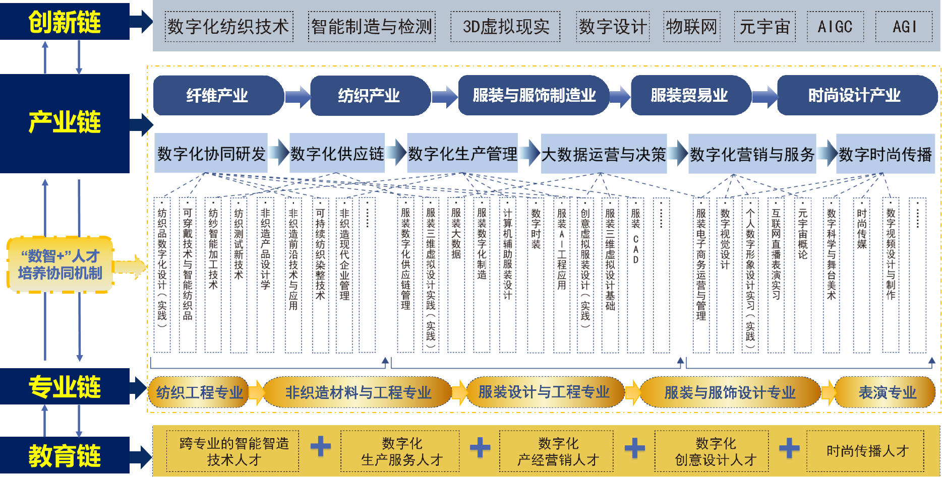 特色:人工智能技术的快速发展推动数字经济的纵深发展,数智化技术在纺织服装领域中的应用是当前产业革命的新趋势、新要求。学院多年来在数智化技术与纺织服装技术的交叉领域深耕,形成了数字化纺织、人体工效学、数字化服装与服饰、数字化营销等特色方向,重点打造数智化全链路研发团队,近年来获批国家自然基金面上项目2项、国家重点研发专项2项、青年基金3项,其中数字化纺织品纹样分析与建模、三维测体、人体工效学均处于国内领先水平,获上海市技术发明奖、中纺联科技进步奖、工博会金奖、上海优秀发明选拔赛金奖等奖项。学院将依托数字科技现代纺织服装产业学院的培育项目,交叉融合各学院学科专业方向,匹配纺织服装产业全链程协同发展需求,以“数智赋能”,构建线上线下共同体的全链路数智化纺织服装科技与应用产教融合平台。学院将紧密对接纺织服装产业的数字化、人工智能发展新趋势,与东方国际、浙江凌迪、上海宝鸟、浙江乔治白、深圳博克、上海英沐等头部企业校企联合,着力打造数字面料创新研发中心、服装设计与智能制造中心、时尚展演与传播中心、消费者洞察体验中心、数字化展演传播人才培训基地、中欧时尚科技研究院等新的“数智时尚”产教融合综合性平台,为区域纺织服装产业的数字化升级转型提供人才与智力支持。