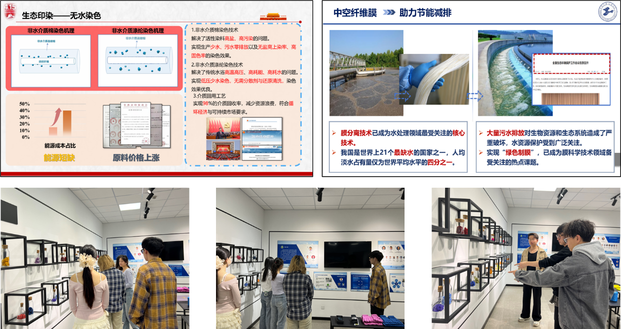 最后,在学院肖长发老师和王际平老师两个高层次团队的带领和支持下,支部党员一起参观了纤维材料研究中心和上海纺织化学清洁生产工程技术研究中心两个高层次团队平台,支部党员结合自身课题研究方向分别在“膜分离技术”及“无水染色”等绿色发展课题方面进行了汇报和分享。相关老师和学生的讲解,为支部党员在开展学术科研提供了新的思路和新的目标。同时,以支部实验室安全员建设为基础,在支部党员参观实验室设施过程中分别就仪器安全和应急措施逐一进行了安全教育学习,实验室安全员的责任意识和安全技能得到不断强化。