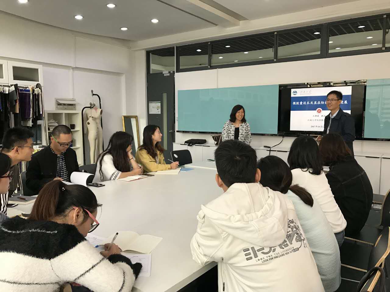 2017年10月13日,应服装学院邀请,江南大学王潮霞教授来我校艺术楼C210举行题为“微胶囊技术及其在纺织中应用进展”的学术讲座,讲座由服装学院辛斌杰教授主持,学院20多名研究生及部分青年教师参加讲座。