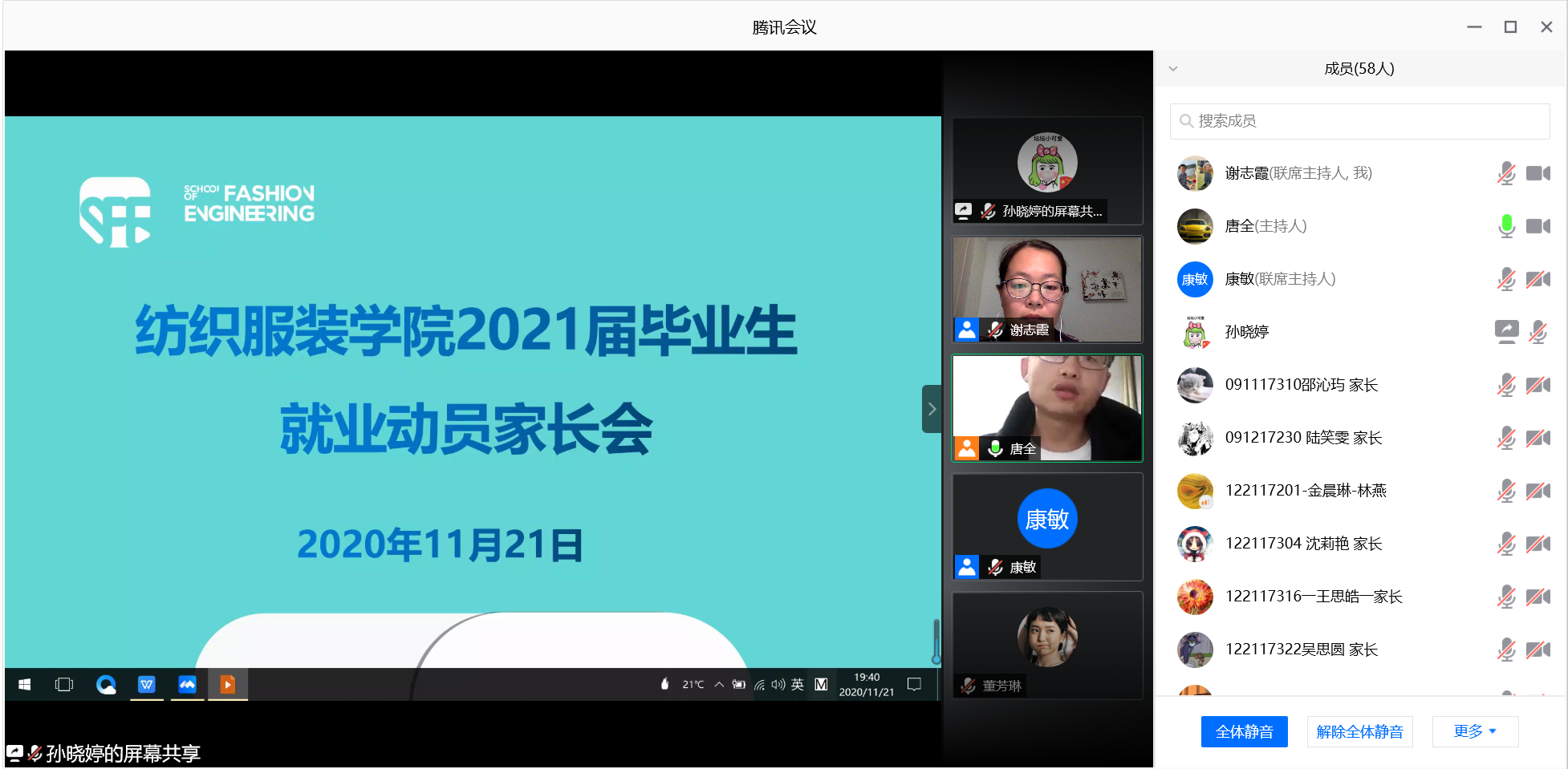 为促进学生应对就业新形势,加强学校与学生家长的沟通,提升同学们的就业能力。11月21日晚19:00,太阳成集团tyc9728通过腾讯会议召开了2021届毕业生就业动员家长会。太阳成集团tyc9728党委副书记谢志霞老师、就业辅导员、毕业班辅导员与毕业生家长参加会议。
