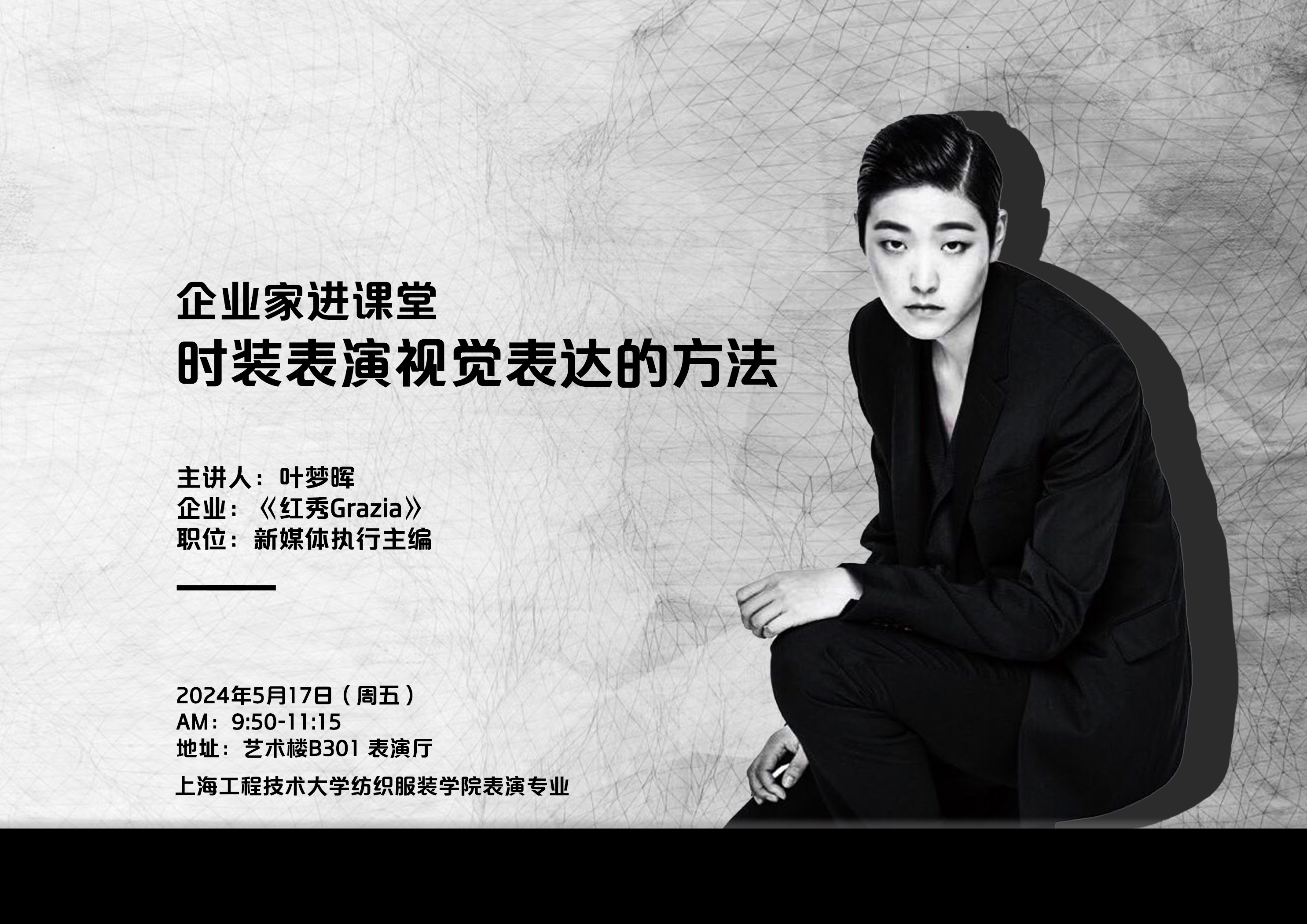 5月17日上午,太阳成集团tyc9728邀请《红秀Grazia》杂志新媒体执行主编叶梦晖走进《服装表演技巧》课堂,在艺术楼表演厅为表演专业2021级本科生展开“时装表演视觉表达方法”主题的知识传授。为学生带来表演视觉传达的实践经验以及时尚行业前沿的信息。