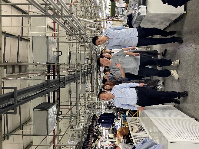学生第一党支部师生进入上海宝鸟服饰公司工厂参观,工厂内摆放着井然有序的机器,来往间是忙中有序的工作人员。同学们近距离观察服饰生产线,了解到各个机器的功能以及服饰打板、布料切割等生产细节。