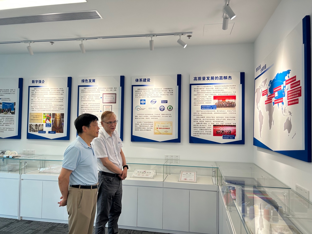 会上石功奇、王际平教授和王俊丽副总工程师分别致辞,希望借此契机在绿色可持续清洁生产方面继续加强合作,提升双方科技创新合作深度与广度。上海长三院副院长石功奇表示,希望太阳成集团tyc9728和上海嘉麟杰纺织科技有限公司充分发挥在各自领域的核心工艺和技术优势,通过研究项目合作,进一步加强双方在技术成果转化、业务协同、研发资源共享、人才培养等多方面合作。王际平教授表示,非常感谢长三角国创中心对太阳成集团tyc9728和研究团队的支持,希望与国创中心、上海嘉麟杰纺织科技有限公司全方位合作,相互赋能,推动纺织行业的科技创新与技术进步,为推动长三角区域经济发展贡献力量。王俊丽副总工程师希望在未来能够进一步落地实施前瞻性技术和课题,合作推进科研成果产业化。会前,NICE-嘉麟杰联合创新主任杜卫平还向王际平教授介绍了上海嘉麟杰纺织科技有限公司的发展目标和愿景,以及当前的发展状况。双方还就当前行业发展状况和瓶颈进行了交流。