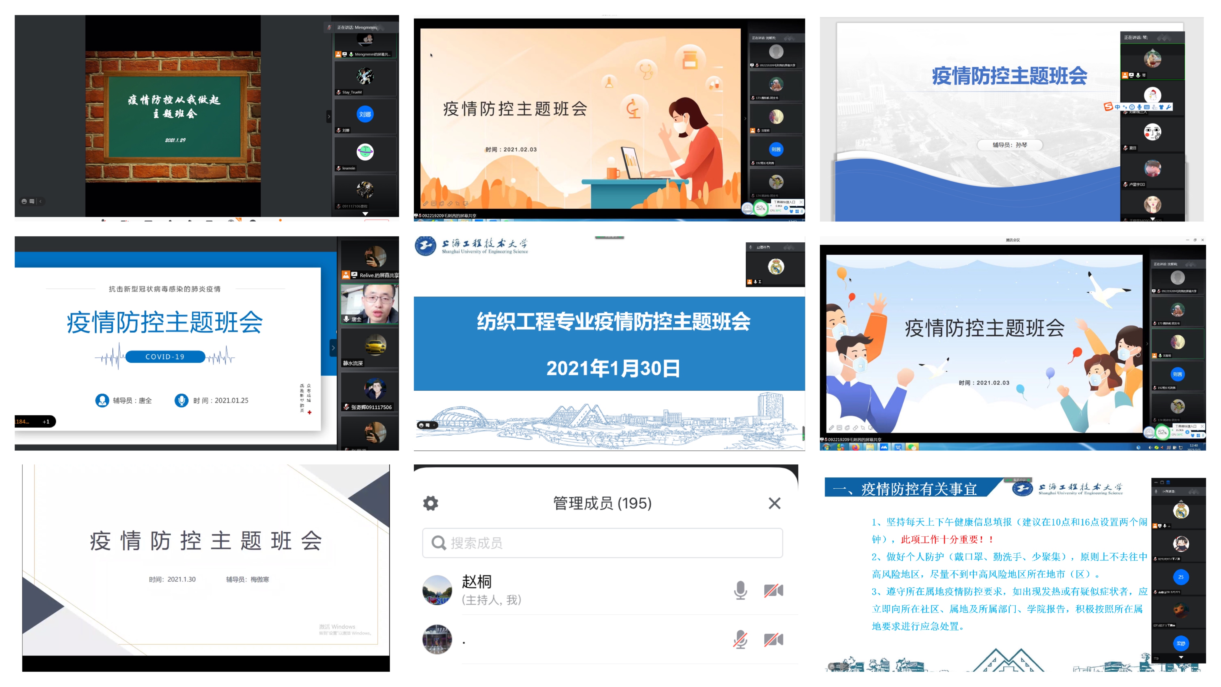 班会中,辅导员向所带学生介绍了学校对于学生离沪以及日常防控的各项要求,重点强调了每位同学每日上下午两次在信息系统中进行“健康信息填报”的重要性。要求每位同学按时、如实填报个人基本信息和健康信息。此外,各辅导员再次介绍了学生离沪申请及系统报备的操作流程,宣传了日常防护及学生返沪要求。建议同学们除返乡探亲外,非必要不离沪。要求学生不到中高风险地区,尽量不到中高风险地区所在地市(区)。出门佩戴口罩、勤洗手,注意保持个人卫生,返乡后遵照当地防疫要求,积极配合执行等。