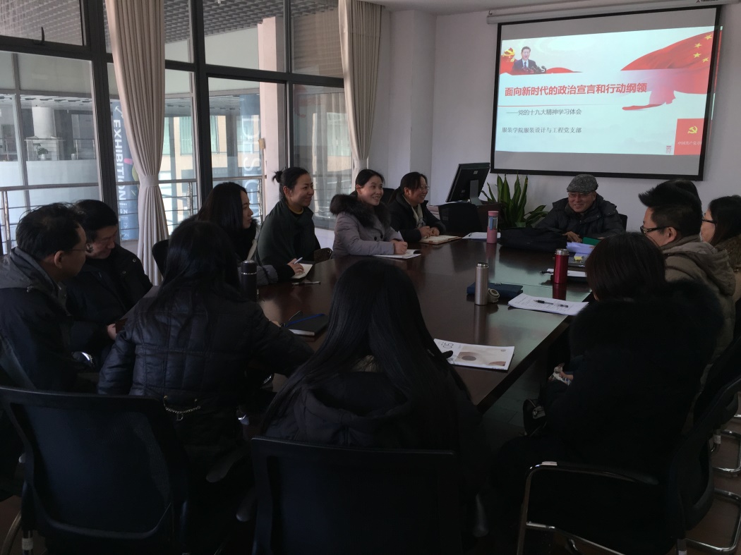 1月12日下午,服装学院服装设计与工程党支部在艺术楼A218开展“学习落实十九大精神,立足岗位做合格党员”的专题学习讨论会。