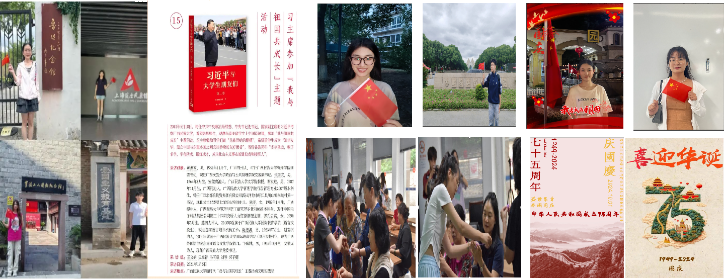 初心如磐忆征程。学院党委组织开展“以青春之名,赴红色之约”家乡红色基地打卡活动,通过打卡红色地标、参观爱国主义教育基地寻找“家乡里的红色记忆”,赓续红色基因,汲取奋进力量。感悟关怀担使命。开展《习近平与大学生朋友们》经典诵读活动,通过著作研读、撰写笔记、交流分享教育学生牢记习近平总书记殷切期望,激励学生努力成长为堪当民族复兴重任的时代新人。 艺韵绽放绘华章。组织师生通过海报设计回顾新中国光辉历程,讴歌党的丰功伟绩,展望祖国未来美好图景。青春挺膺担当。学院党委依托区域化党建平台,组织学生党员进入社区持续开展科普进社区活动、宣讲中华传统文化,为增强民族自豪感和文化自信贡献青春力量。青春表白共芳华。国庆当天,组织师生党员通过一张张与国旗的合影,向祖国深情告白,献礼国庆、致敬祖国。