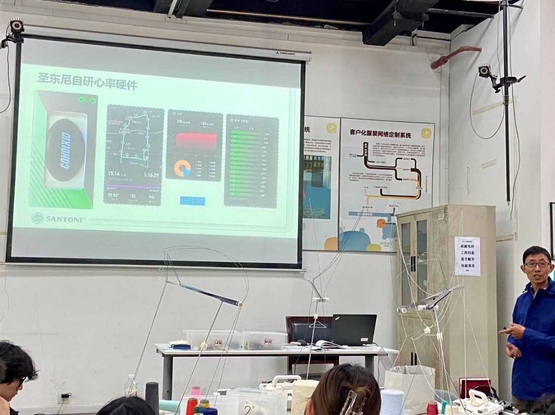 在讲座过程中,夏总给同学们讲述了圣东尼无缝针织研发的最新产品,包括各类吸湿快干运动服、银纤维面料的制备(测心率)与智能可穿戴服装的研发。使同学们更直观地了解企业的最新技术与产品研发思路,以及企业对人才的需求。讲座结束后,还留出答疑时间,一名同学就自己的大创项目和夏总进行了深入探讨,并提出了后续合作的可能性,夏总非常欢迎同学们进圣东尼公司参观及洽谈项目。