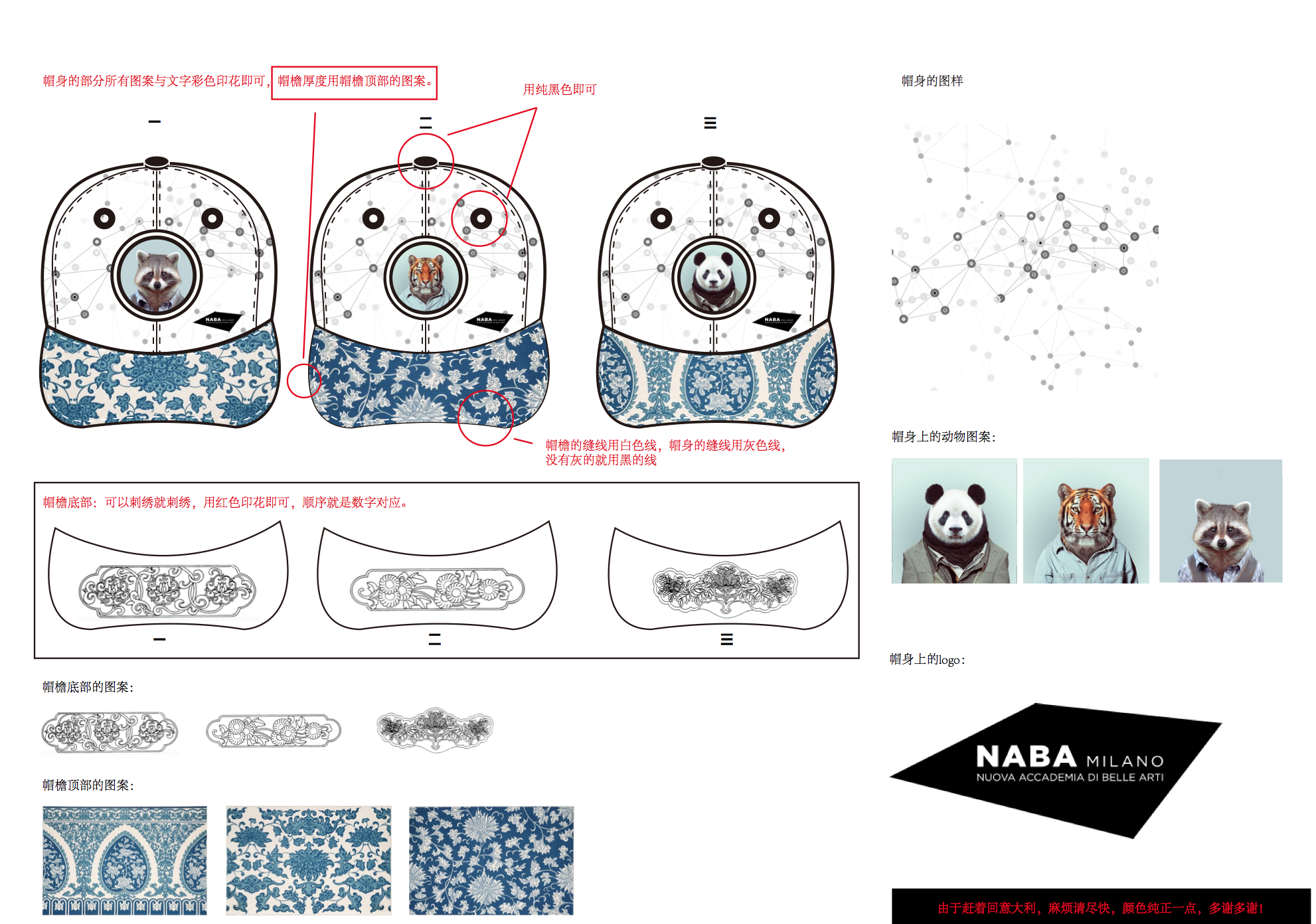 魏鸿宇同学设计作品《NABA嘻哈帽设计》,其灵感来源于“动物形象”,通过结合米兰新美术学院的校园文化,帽身主体运用星辰和手绘动物头像,利用现代的服用面料搭配出时尚的服饰产品。主要面料采用热转印工艺,简单大气。是极具可穿性的春夏时尚单品,作品更加体现了保护动物的理念与现代艺术的发展与融合。