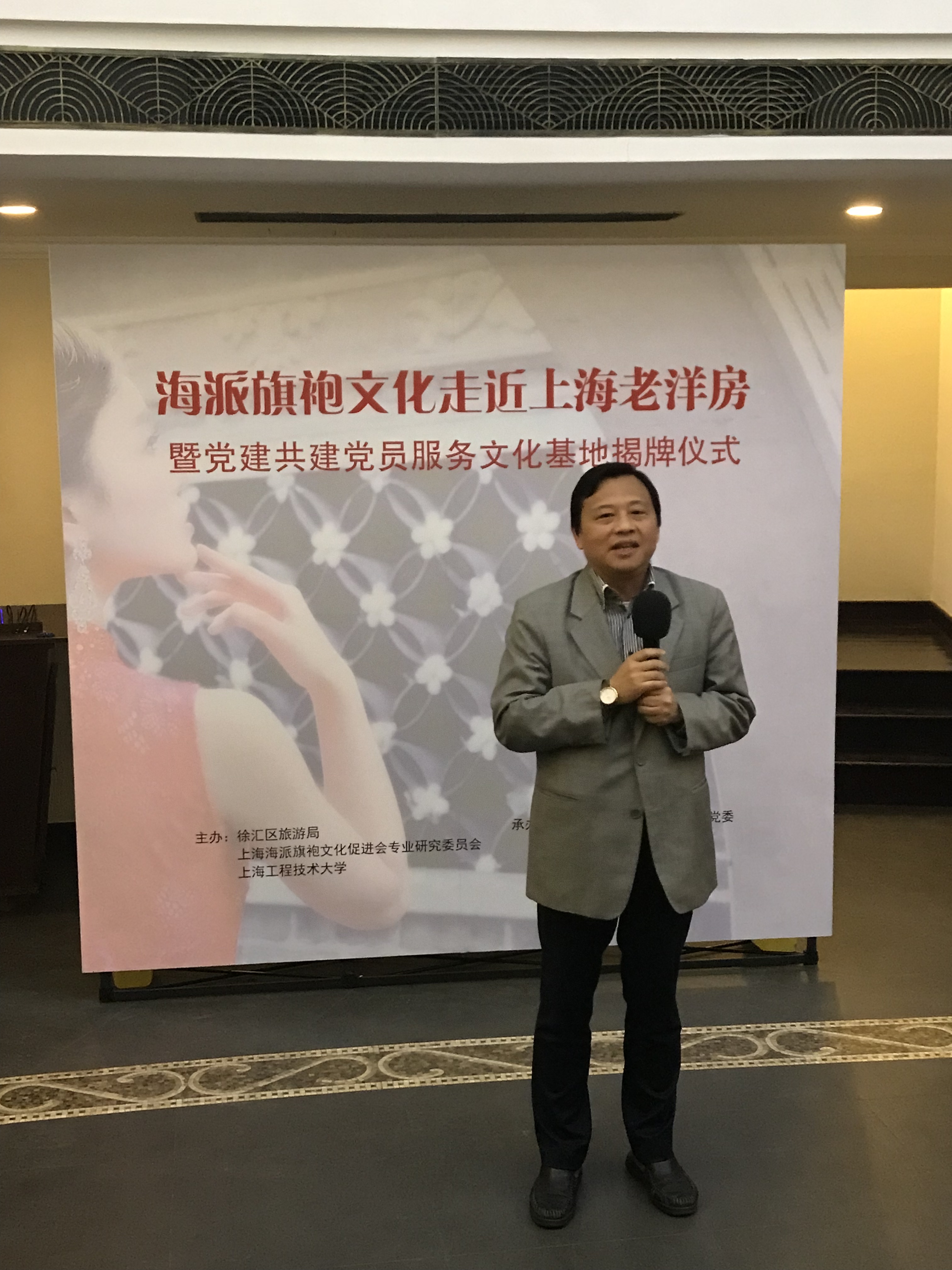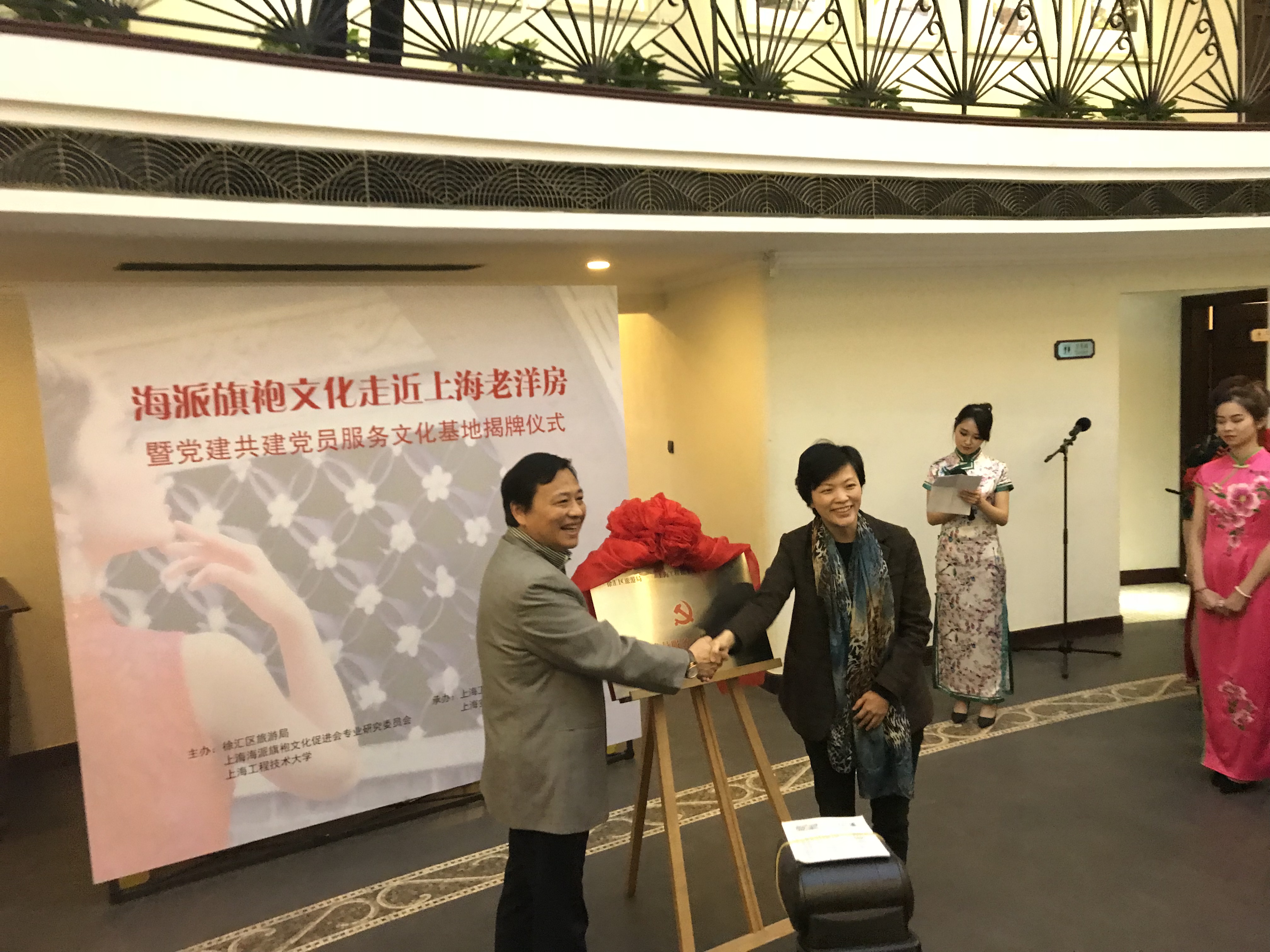 随后,校党委副书记史健勇、徐汇区旅游局局长金伟红共同为党建共建党员服务文化基地揭牌。所有嘉宾一同观看了《漫步武康路》宣传视频,聆听了海派旗袍服饰搭配讲座,并在徐汇区旅游局金牌讲解员的带领下了解上海老洋房的故事。