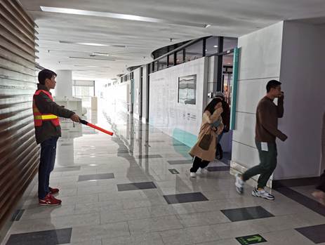 长期以来,学院始终把师生安全工作摆在战略和全局的高度来抓紧抓好。为确保这次演练顺利开展并达到预期效果,学院进行了周密部署,制定了切实可行的紧急疏散演练预案,成立演习指挥小组,对整个演练活动进行了精心准备和充分的安排。当假象火情发生后,二楼实验室里的师生按照紧急疏散示意图,按次序先后进行撤离,达到了演练预期目标。