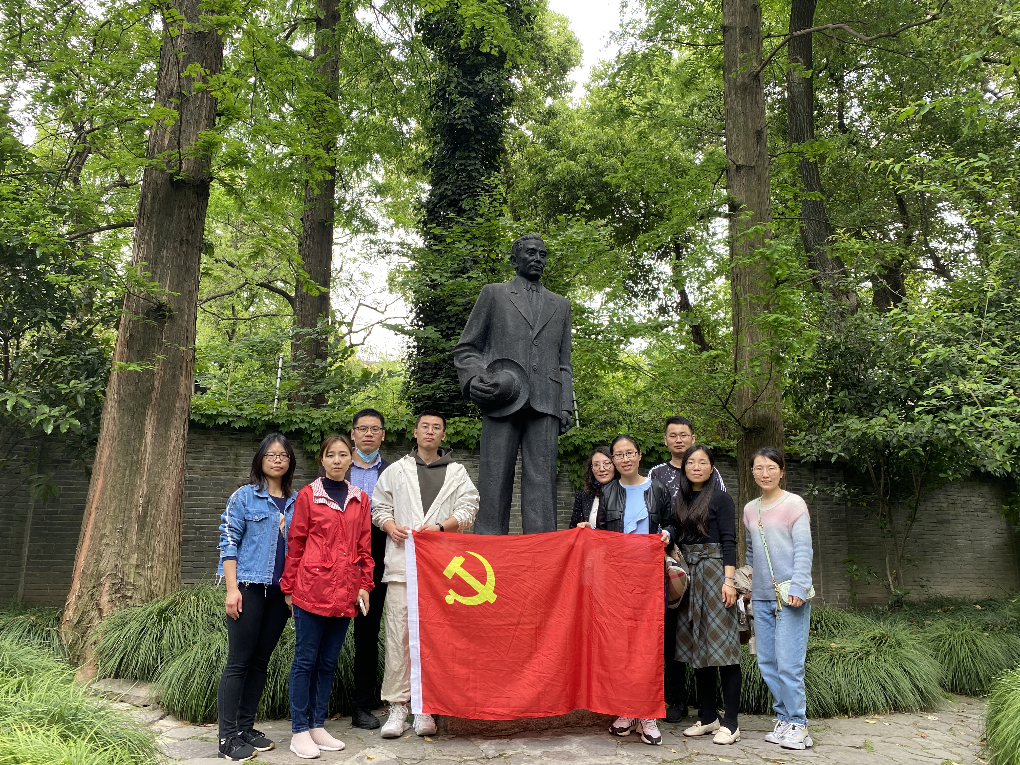 通过学习,每一位党员都被先辈们的英勇事迹、勤俭节约,艰苦奋斗的精神深深打动与感染。随后,大家怀着浓烈的敬仰之心,以极大的热情来到庭院中,瞻仰伟大领袖周恩来总理的全身塑像,并集体合影留念。