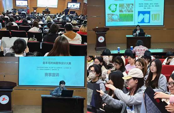 中国服装设计师协会产业中心项目经理苏文婷围绕大赛背景、赛程安排、评分标准、赛事服务及晋级规则、奖项设置等关注热点,为在场师生展开深度剖析,进一步增强了年轻设计师们的信心和动力,为充分备赛提供了明确指引。南山智尚面料设计师禚慧对精纺羊毛进行了科普,让同学们了解到它的织造过程、纤维特点、织纹外观,以便使同学们能够更有效地将精纺羊毛运用于制作服装。The Woolmark Company(国际羊毛局)客户经理贺郁、郑贝妮以2025/26AW美丽诺羊毛纱线和面料趋势为题,与在场师生共同探索羊毛服饰产业的发展与趋势。她生动阐释了设计师在实际创作中如何娴熟运用羊毛元素,向同学们展示了羊毛时尚设计的独特之处。