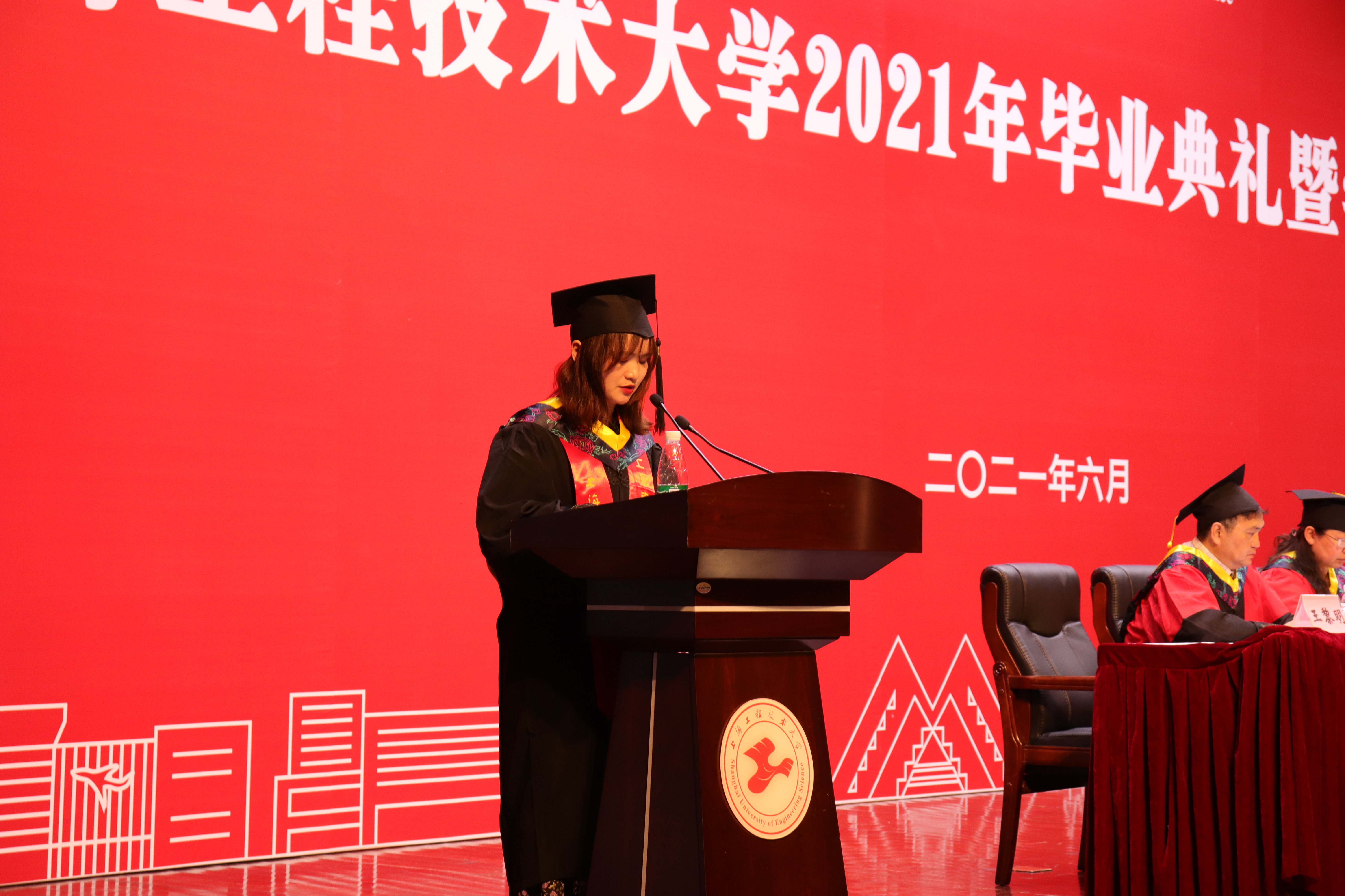 学院党委副书记、院长谢红向圆满完成学业的2021届全体毕业生致以衷心的祝贺和美好的祝愿。希望同学们“永远拥有梦想、永远有用情怀、永远拥有行动”,树立明确的奋斗目标,具有高度关注和参与人类社会发展额自觉性和自信心,具有迎难而上的勇气、毅力和恒心。希望同学们带走的不仅仅是工程大的文凭,更要带走工程大人为理想而奋斗的精神,怀有“为天下计”、“为苍生计”的情怀,“慎言行,敏于行”,“难事做易”、“大事做细”,用在工程大聚齐起来的智慧与自信,书写自己的精彩人生。