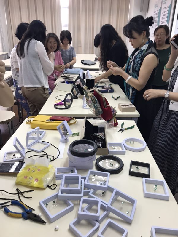 女红作为中国传统文化的一部分,自有她独特地魅力。毕竟她伴随人类文有几干年的历史了,而且与人们的常生活密不可分,与各地的民族习俗紧密相连,与深厚的社会文化一脉相承。此次活动特意邀请到了旗袍手工制作传习人周丽丽老师,周老师出生于旗袍制作世家从小耳濡目染,同样是东芳韵旗袍品牌创始人。周老师为老师们亲自示范并讲解了布艺纽扣的设计和制作,布艺纽扣用途广泛,可以作为丝巾扣、胸针等首饰为生活增添独特的优雅与内涵。老师们在周老师手把手地教授下相继做出了属于她们自己的布艺耳饰作品,大家无不满心欢喜。此次活动布艺纽扣的手工制作,不仅可以唤起我们对于中国传统手工久违的回忆,迟到的欣赏,更是唤起了我们保存她,爱护她的责任心,和发掘和弘扬中国传统文化的内涵与精神。
