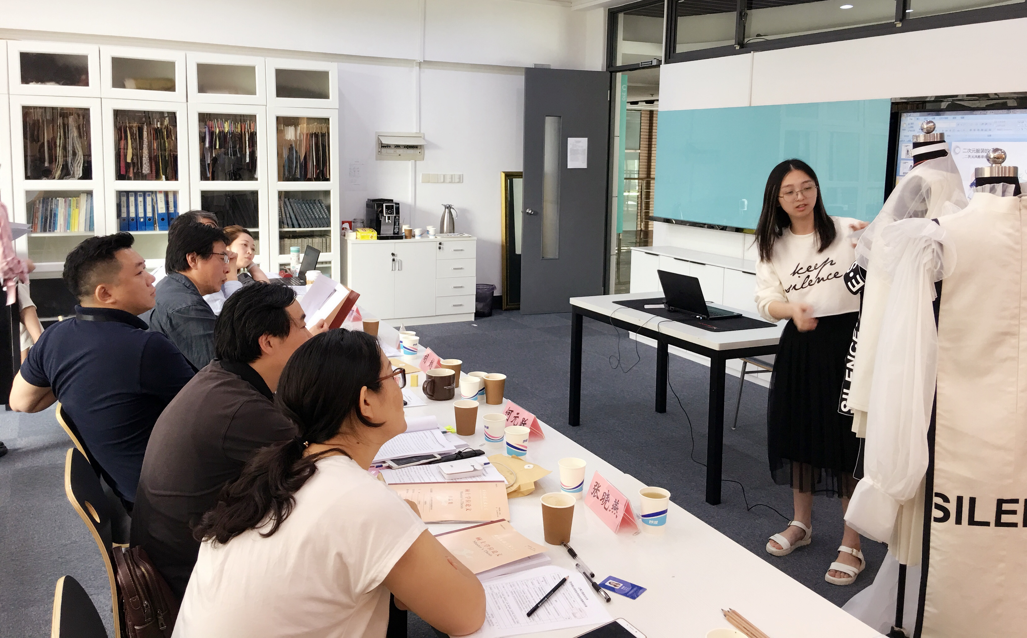 服装学院2015级艺术设计专业时尚艺术设计方向硕士研究生,毕业论文答辩于6月9日在艺术楼C210顺利举行。本次答辩主席邀请了东华大学刘晓刚教授,此外还邀请到了上海交通大学副教授陈贤浩、中国美术学院上海设计学院副教授何元跃;学院胡越教授、张晓燕副教授,中法学院周晓鸣副教授、中法学院吴湘济副教授、中法学院徐蓉蓉副教授、中法学院李春晓副教授六位校内委员也出席了答辩会。