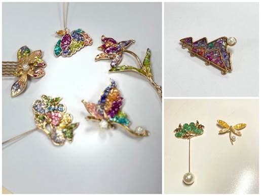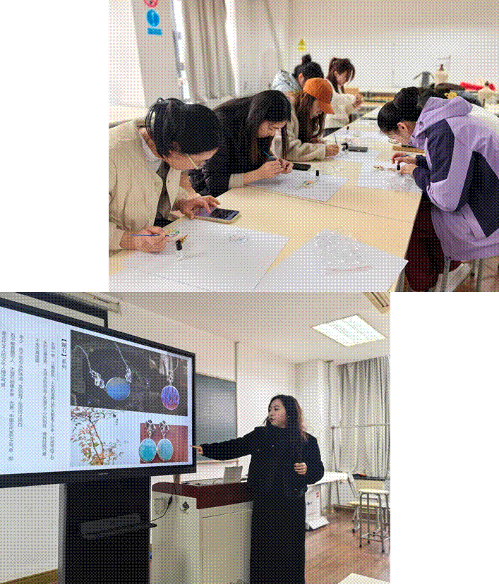 螺钿首饰DIY活动环节,老师们选择了喜爱的胸针、发夹、发簪等日常配饰作为创作载体,在谷老师的讲解和指导下,开始了螺钿首饰DIY创作。随着时间的流逝,不同色彩的贝母在老师们的手中经过细心点缀和镶嵌,变成一枚枚精巧、色彩斑斓的工艺品,呈现出创作者的心意和巧思。