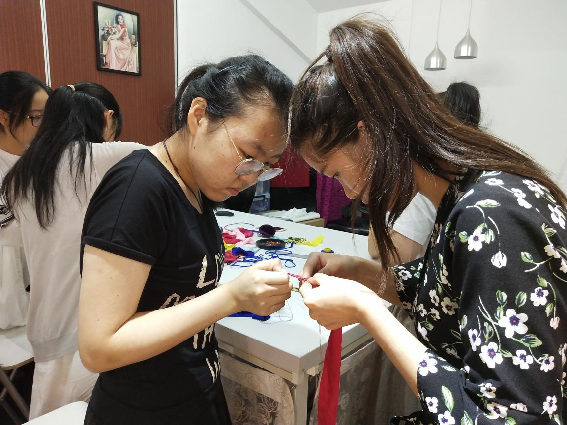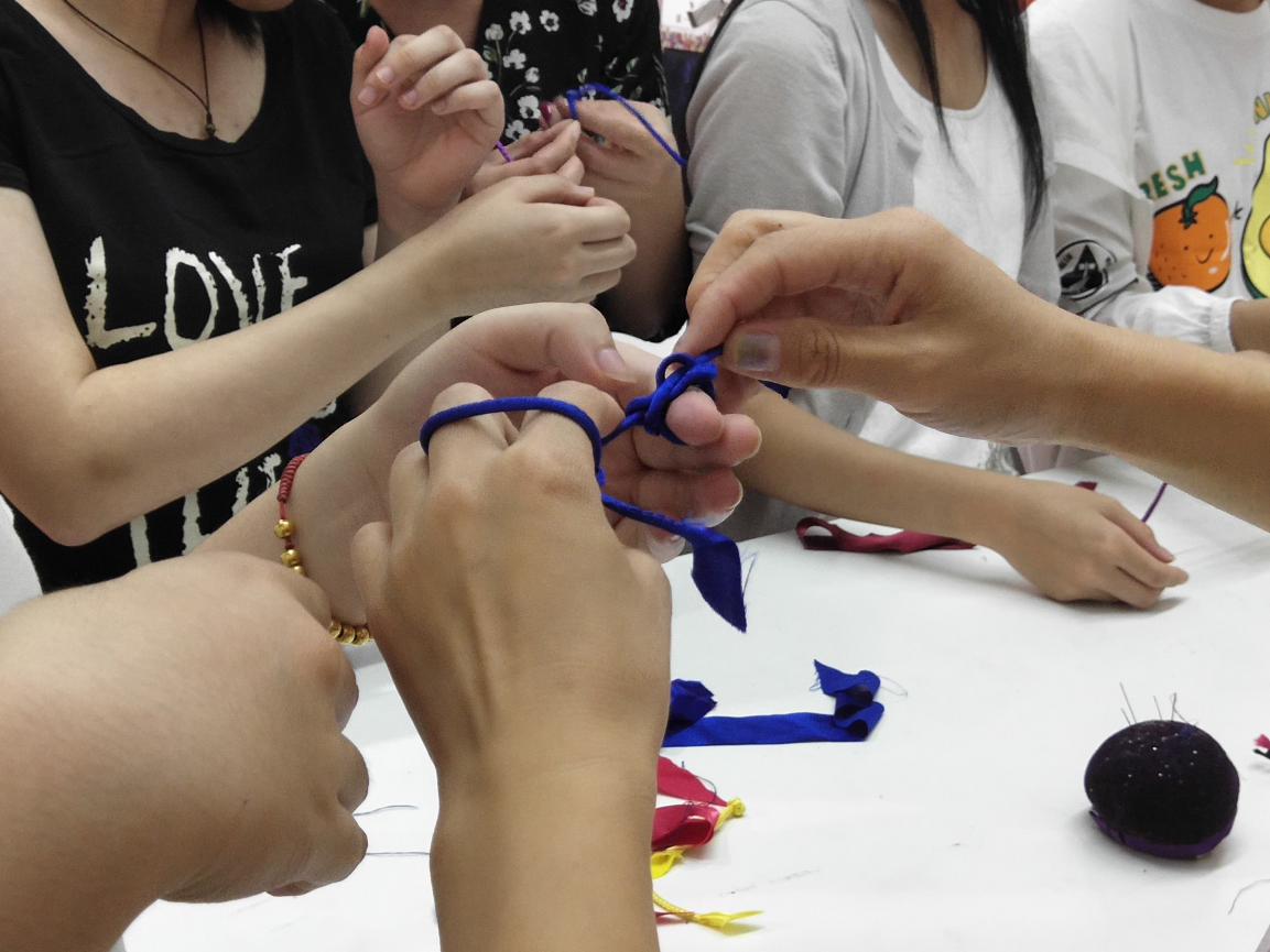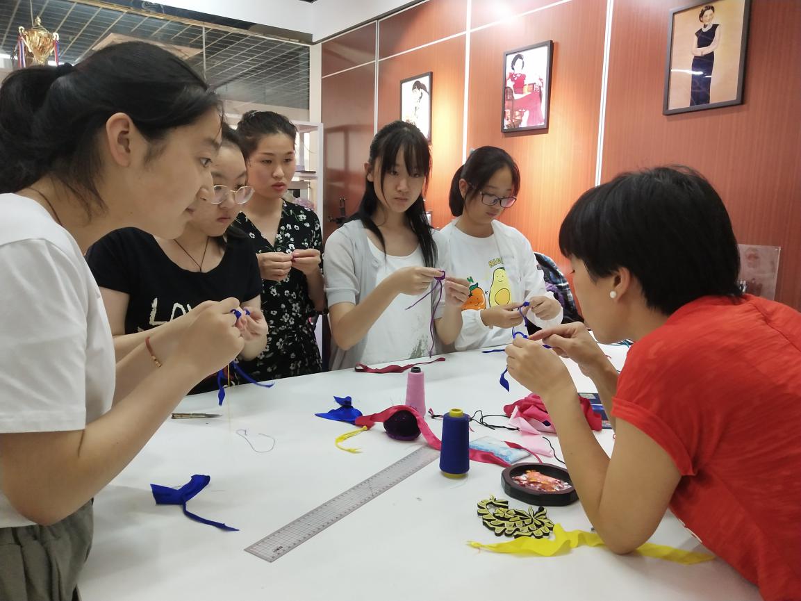 最后,研究生小导师们各自带队负责进行了课题实验学习。海派旗袍组前往了教学楼旗袍传习工坊,在企业老师的悉心指导下认真学习了旗袍盘扣制作,从一针一线手缝布条到盘扣的造型变换,同学们体验到了盘扣对旗袍产生的美学影响,也更加了解了传统服饰文化的魅力。