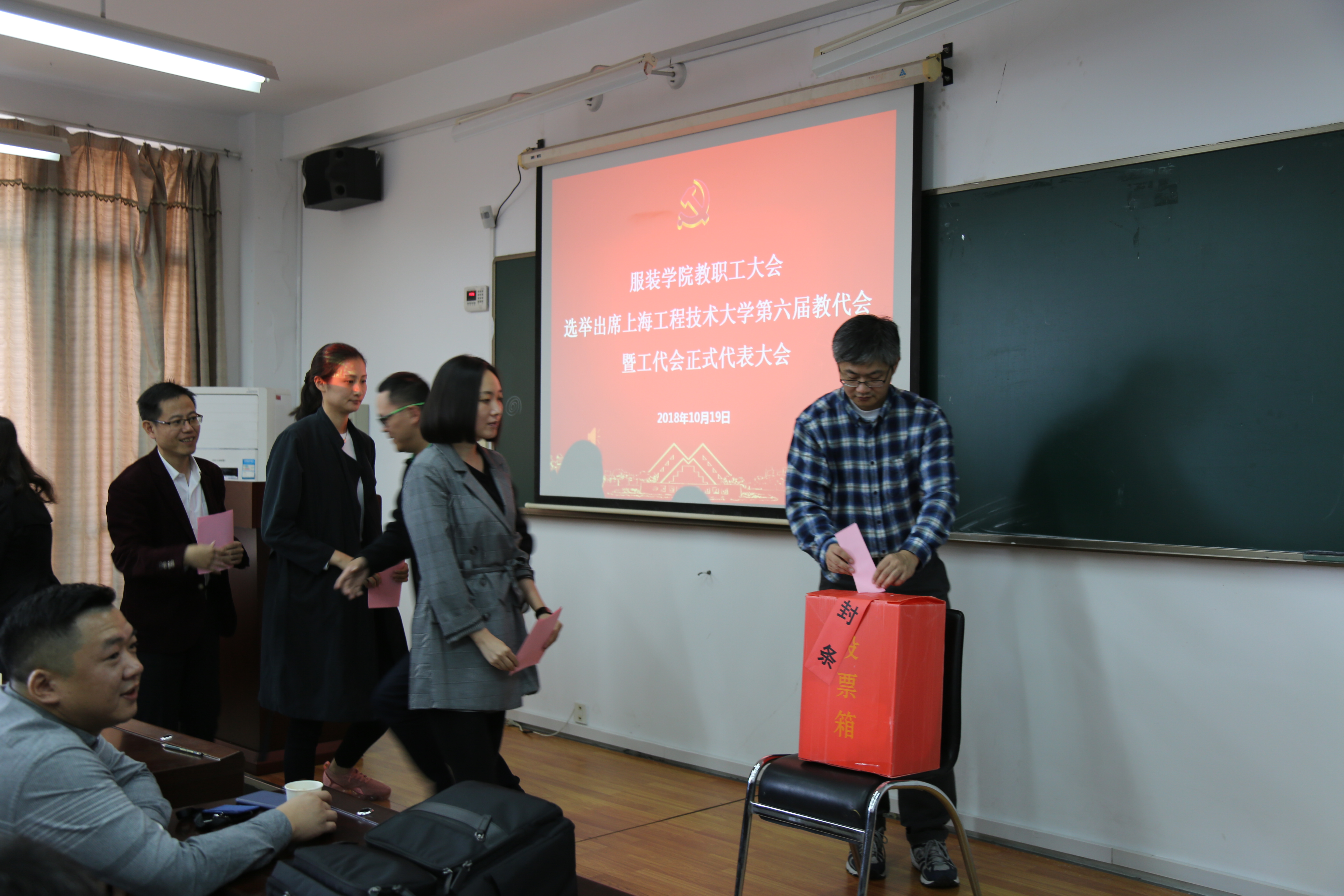10月19日下午在艺术楼C310服装学院隆重召开全体教师代表大会,选举校工代会代表。同日上午在仙霞路校区中法时装设计师学院同步召开换届选举事宜。会议由院党委副书记谢志霞老师主持,院党委书记袁蓉老师、院长谢红老师、院工会主席王黎明老师出席了本次会议。会议在国歌声中隆重召开,会议按既定议程,由主持人宣读大会选举办法,推选并通过监票人、计票人人选,逐一介绍代表候选人情况,填写选票,并按指定顺序进行投票,监、计票人开箱清点选票,经过清点收回的选票和计票,由监票人丛珊老师向大会报告每位候选人的得票情况,主持人宣布选举结果,最终服装学院党委顺利选出校工代会正式代表9名。整个选举过程规范有序,学院在院党委的领导下,以高度负责的精神、严谨细致的作风,圆满完成了换届选举的工作任务。