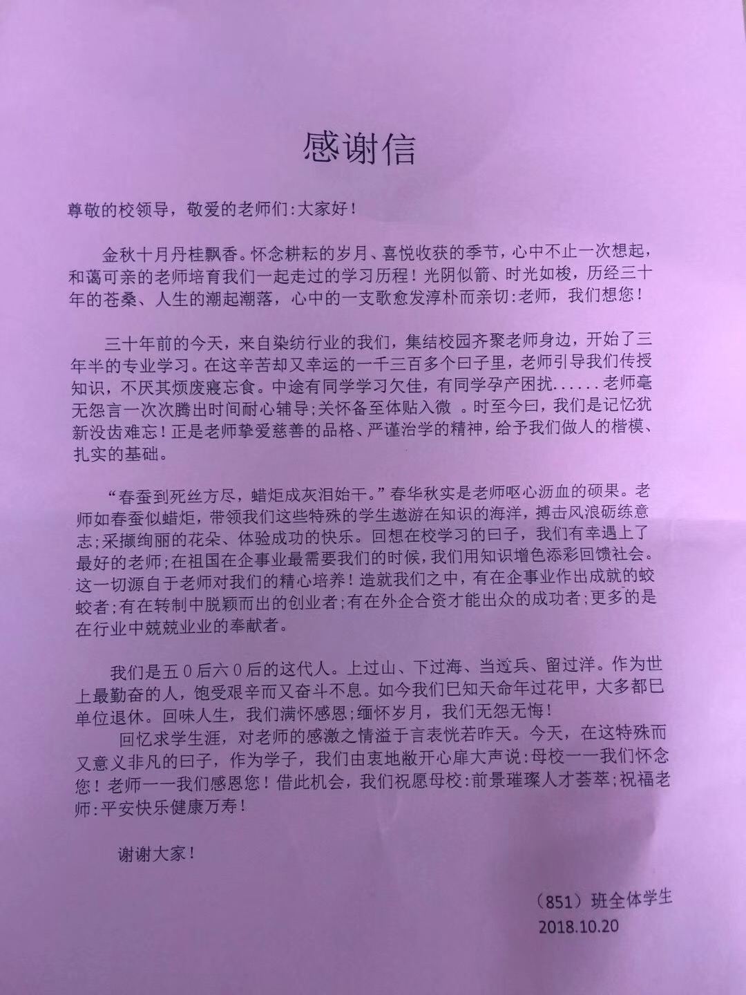 活动当天,染整851班在新村路校区当年上课教室“重返课堂”,在松江校区校园内领略了学校环境的广阔和优美,在服装协同创新中心体验了服装智能定制的高端前沿,在40年历程签名墙上留下了美好的祝福和签名。纪念活动很短暂,但对母校的感情和祝福是长远的,让我们共同祝愿母校40周年:生日快乐!