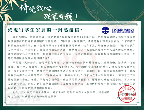 在八一建军节前夕,学院通过“线上+线下”形式开展慰问活动:一方面,学院与学生家长电话沟通,详细了解现役学子在役情况,转达学院的关心与期许;另一方面,学院向在役学生家庭寄送慰问信及节日礼包,送出学校和学院浓浓的节日问候和祝福,学生家属表示由衷感谢学院的关心,将全力配合学院教育引导工作,勉励子女争做能吃苦、有志向、讲奉献的栋梁之才,用优异成绩回馈学院培养与社会期待。