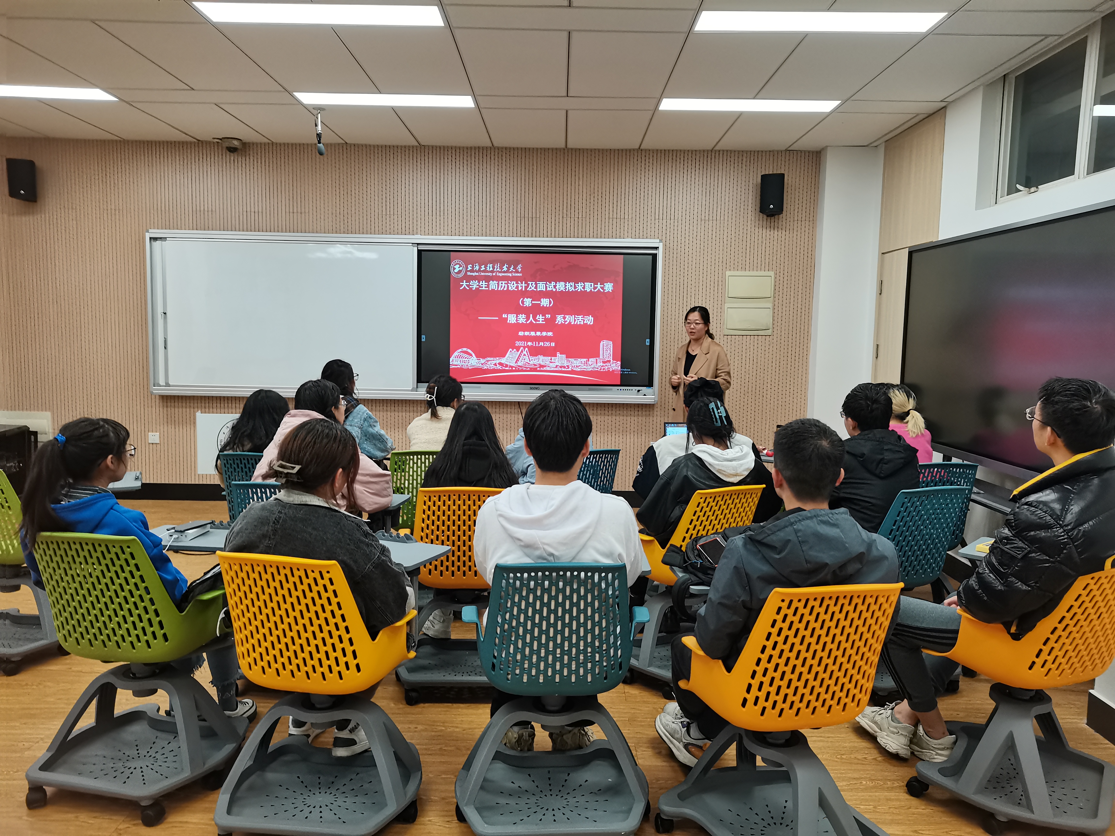 11月26日下午, 太阳成集团tyc9728“服装人生”系列活动——大学生简历设计及面试模拟求职大赛(第一期)活动在教学楼D319顺利举行,本次活动邀请到了斐乐服饰有限公司、上海三枪集团有限公司、雅莹集团股份有限公司、上海纳薇服装设计有限公司的资深HR担任评委,从参赛简历中选出10份“最佳简历”,并邀请评委和被选中“最佳简历”的同学进行现场模拟面试。