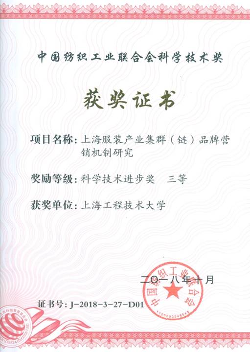 2018年度中国纺织工业联合会科学技术奖共评选出113个项目,其中一等奖16项、二等奖45项、三等奖52项,服装学院胡守忠教授主持完成的“上海服装产业集群(链)品牌营销机制研究”获得科技进步三等奖。