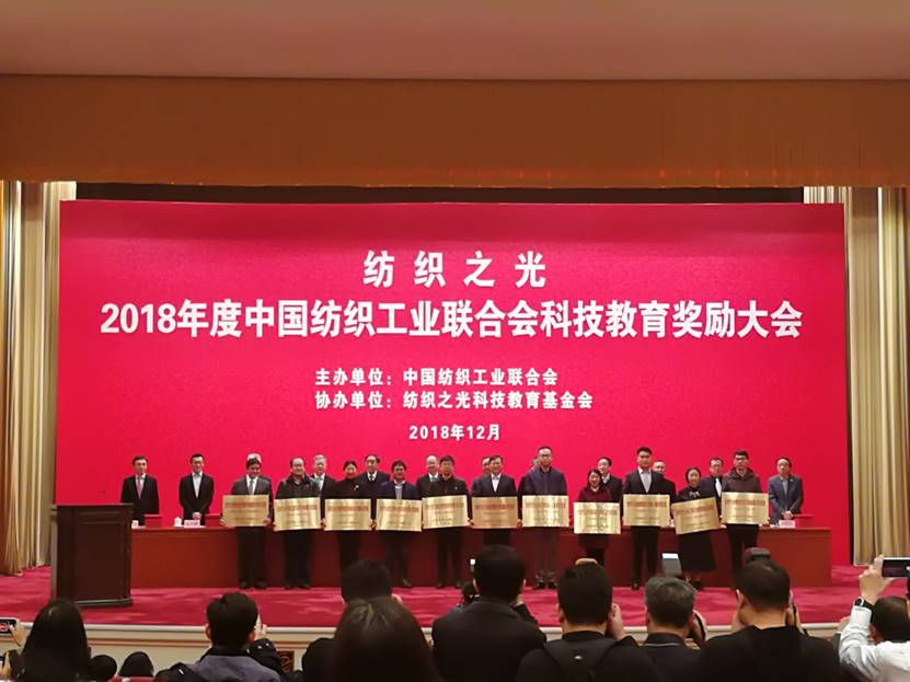 12月5日上午,由中国纺织工业联合会主办,纺织之光科技教育基金会协办的“纺织之光”2018年度中国纺织工业联合会科技教育奖励大会在北京人民大会堂召开。中国纺织工业联合会党委书记兼秘书长高勇,会长孙瑞哲等领导出席大会并为获奖代表颁奖。