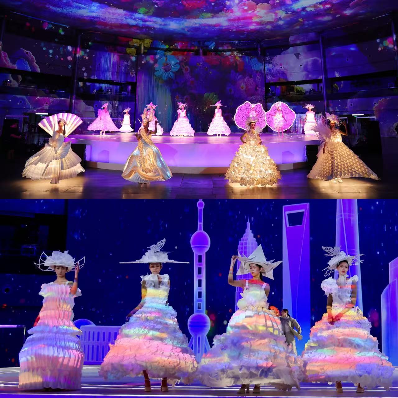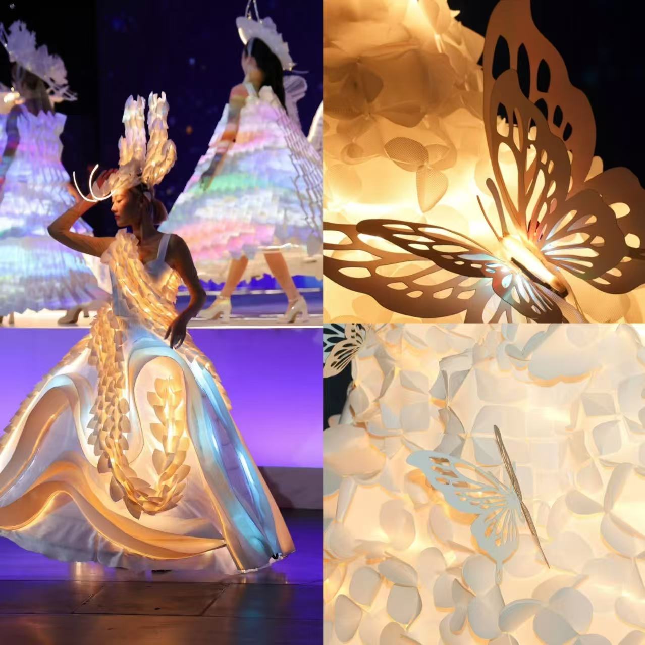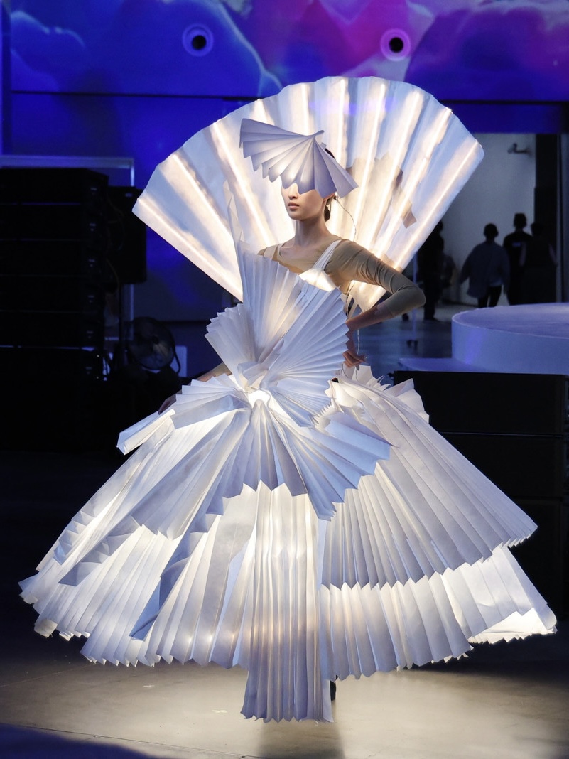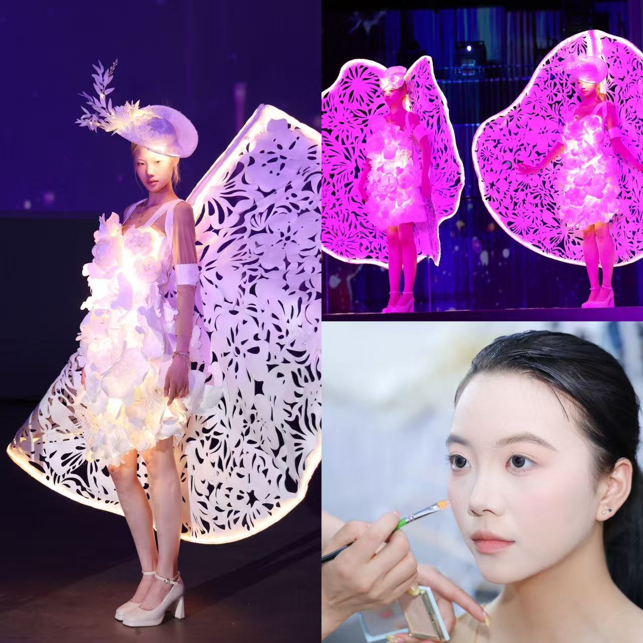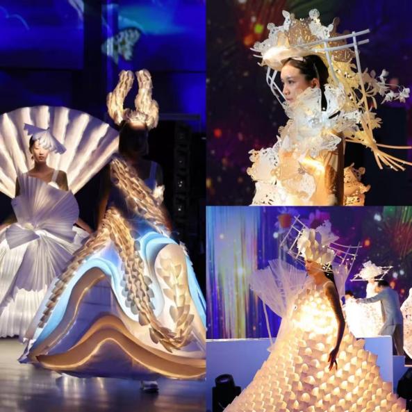 9728太阳集团表演专业学子作为核心演绎者,身着融合非遗剪纸与现代折纸艺术的环保复合“纸艺华服”,以沉稳的台风、精准的肢体语言和饱满的艺术表现力,在瞬息变幻的光影中精准诠释了作品从探索追寻到自我绽放的深刻内涵,成为全场瞩目的专业亮点。