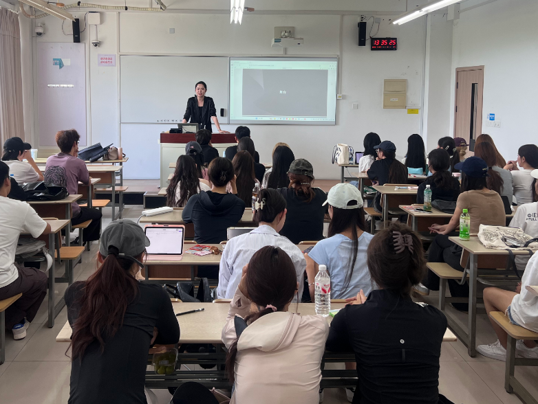 课堂伊始,李诗芸学姐以三个不同身份——模特、双语主持人、舞台导演为主线,生动讲述了自己的职业成长历程。她从在校期间学习表演专业时的初次模特面试经历讲起,由浅入深地分享了作为一名新人模特内心的忐忑与成长。随后,她以2022世界人工智能大会总结会的双语主持经历为例,讲述了那次经历如何点燃她对主持事业的热爱,并由此踏上多次主持工作的新征程。课堂氛围活跃,通过互动提问,以同学们熟悉的“追星”话题为引,娓娓道来自己如何从一名台下观众,成长为担任明星活动总导演的蜕变过程。