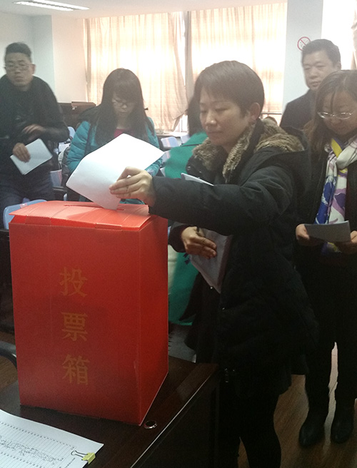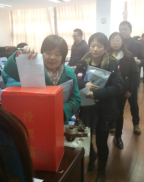 会议进入第二项议程,2015年度领导班子和领导干部年度考核测评。院党委袁蓉书记、李扬副书记、副院长沈勇、副院长胡越先后上台向代表们做述职报告,并以无记名投票的形式做出评议。