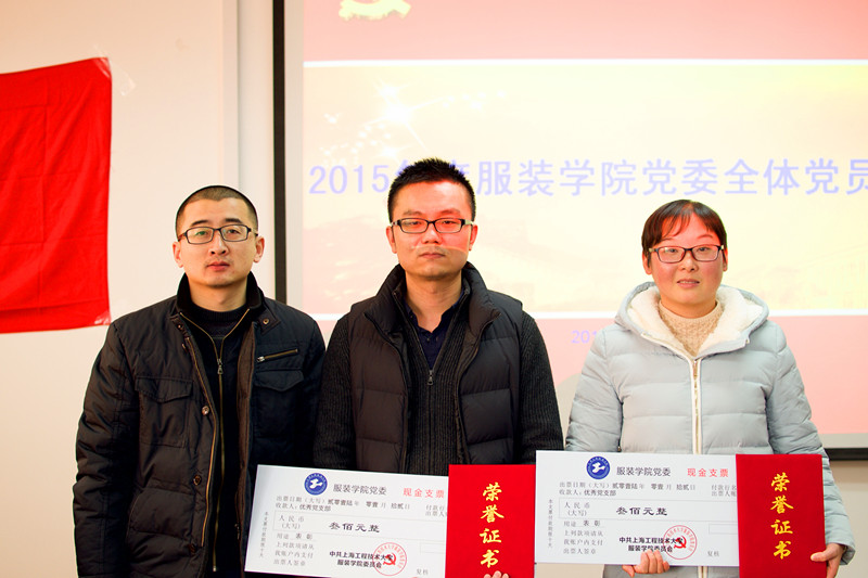 服装学院党委书记袁蓉首先就2015年服装学院党委工作向全体党员作了报告,接着各党支部书记逐一作了年度工作述职。经过与会全体党员的投票,服装学院党委评出了优秀党支部书记:学生第一党支部书记陈小琼、纺织工程专业团队教工党支部白燕;优秀党支部:学生第一党支部、艺术设计专业团队教工党支部等。服装学院党委副书记李扬为获奖的党支部书记、党支部颁奖。会上,学院党委也为此次在民主评议党员中获得优秀的党员进行了表彰。