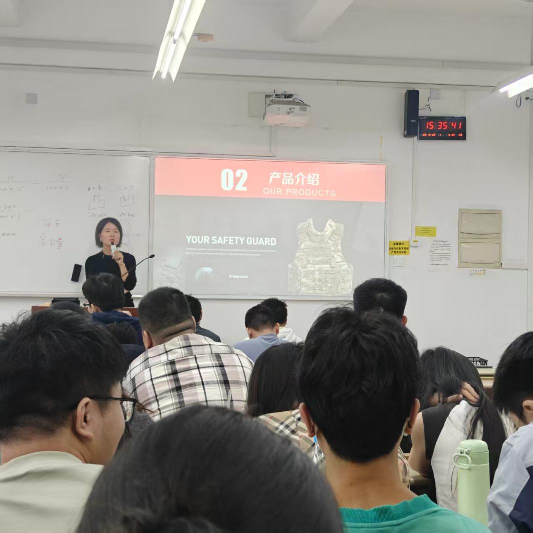 徐永红女士是“金山英才”镇江制造 2025 领军人才,是“镇江市创业明星”,徐董事长先介绍了自己的创业历程,并着重讲了从校园创新创业大赛走上创办企业的心历路程及实践经验,鼓励同学们在校期间要积极参加各类竞赛活动,为未来做好规划,为毕业打牢基础。 之后主要介绍防护用高性能纤维复合材料的研发及其在防弹衣、防弹头盔及装甲车上的应用,介绍了“高效纤维吸热防弹插板”和“热塑改性 PEUD 布”等国家级专利密集型产品,材料性能及产品特色深深地吸引了同学们的关注,讲座结束之后同学们纷纷提问。