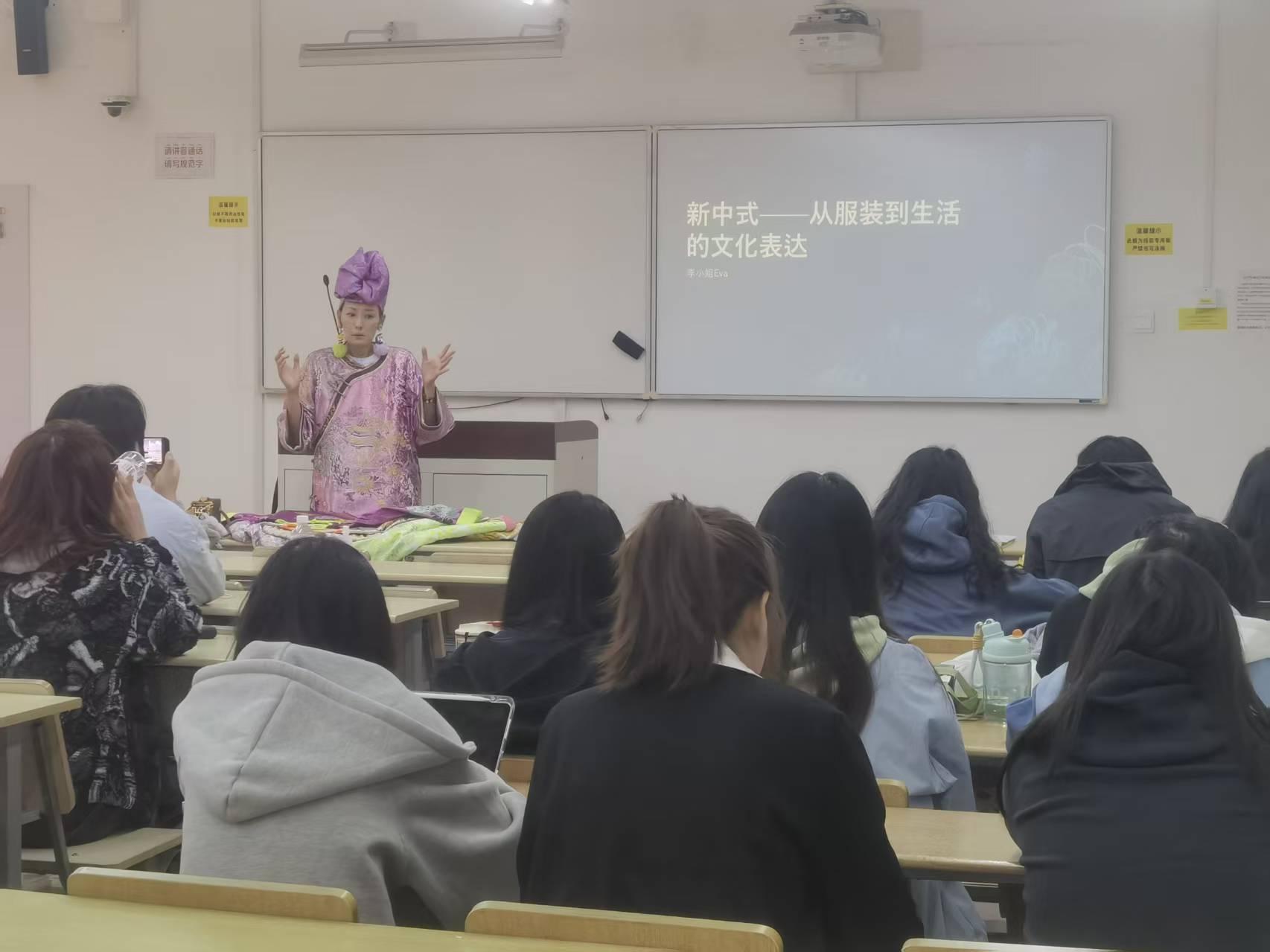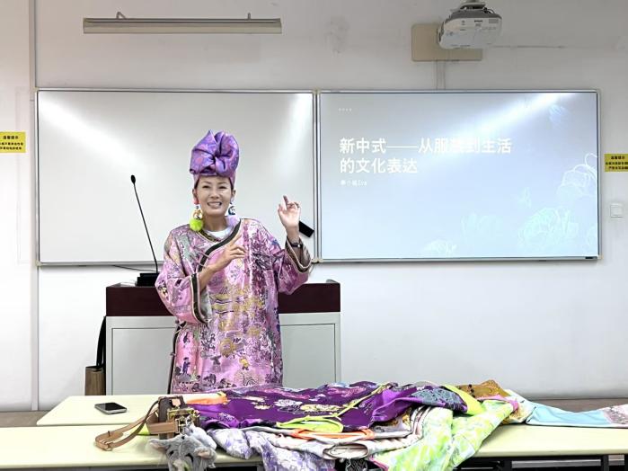 为了进一步践行产教融合、校企合作协同育人的理念。本学期,“品牌服装设计与企划”课程邀请上海知名时尚博主、WOLEE品牌创始人李颖骅走进课堂,针对品牌风格及产品开发,给同学们做了一场“新中式:从服装到生活的文化表达”的专题讲座。