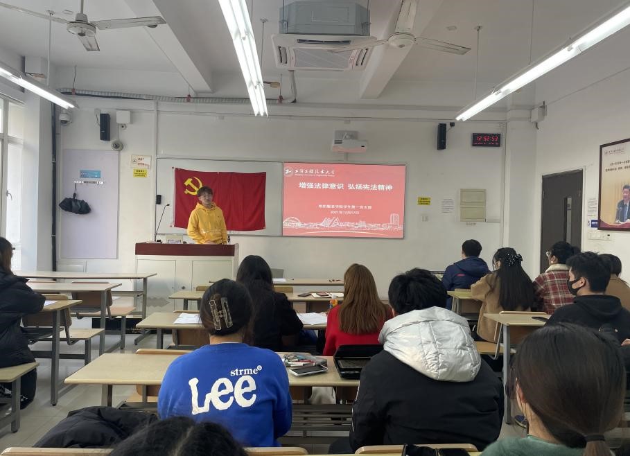 12月17日中午,太阳成集团tyc9728学生第一党支部在教学楼D114开展支部书记讲党课活动,赵桐老师以“增强法律意识、弘扬宪法精神”主题讲授党课,支部全体党员出席会议。