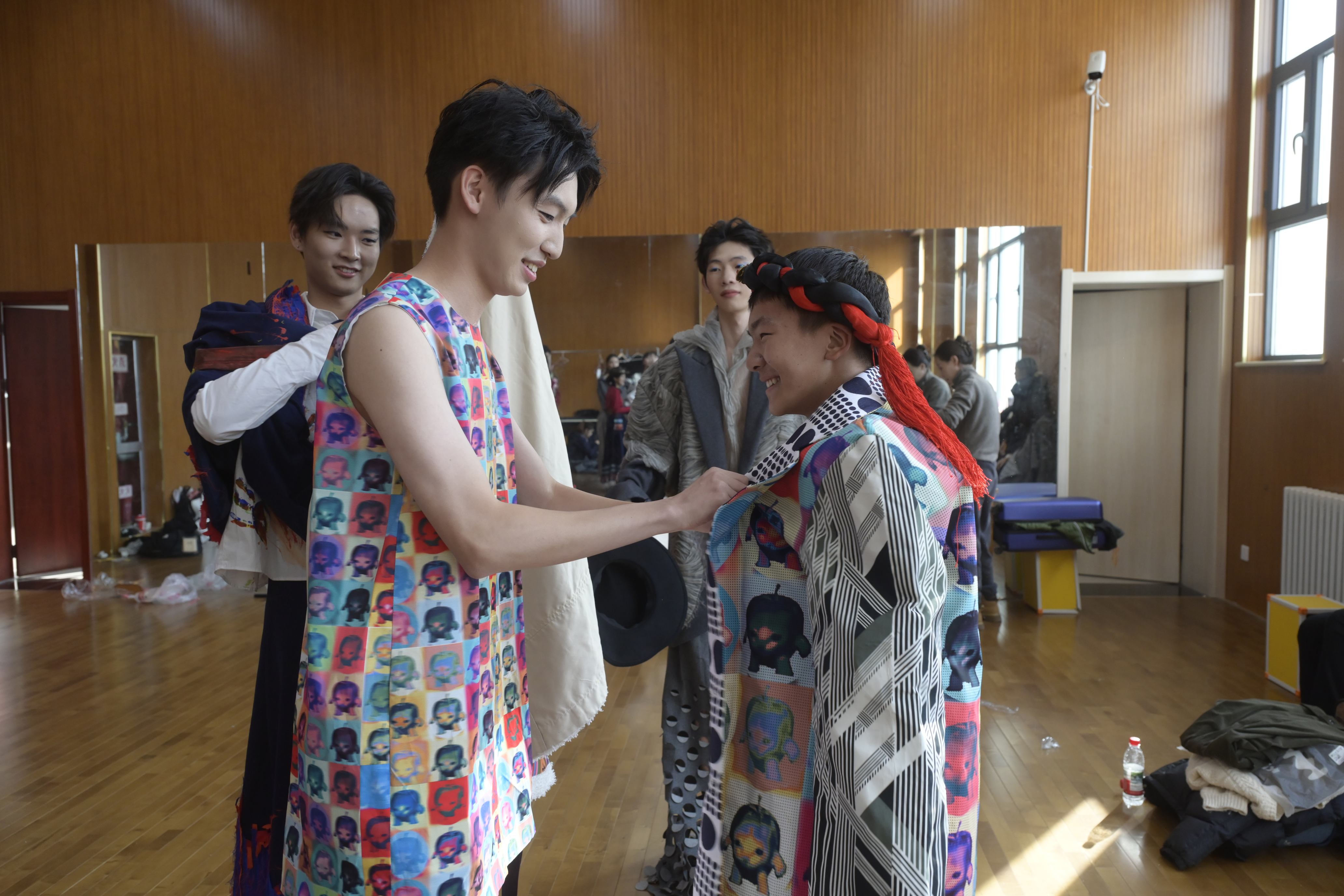 演出结束后,互动交流环节成为焦点。上工程与果洛学生围坐一堂,主动分享服装的设计思路,当地学生则热情介绍藏族服饰的纹样寓意与文化传承。当海派时装遇上藏式氆氇长袍,双方学生兴致勃勃地开启服饰交换穿搭体验。