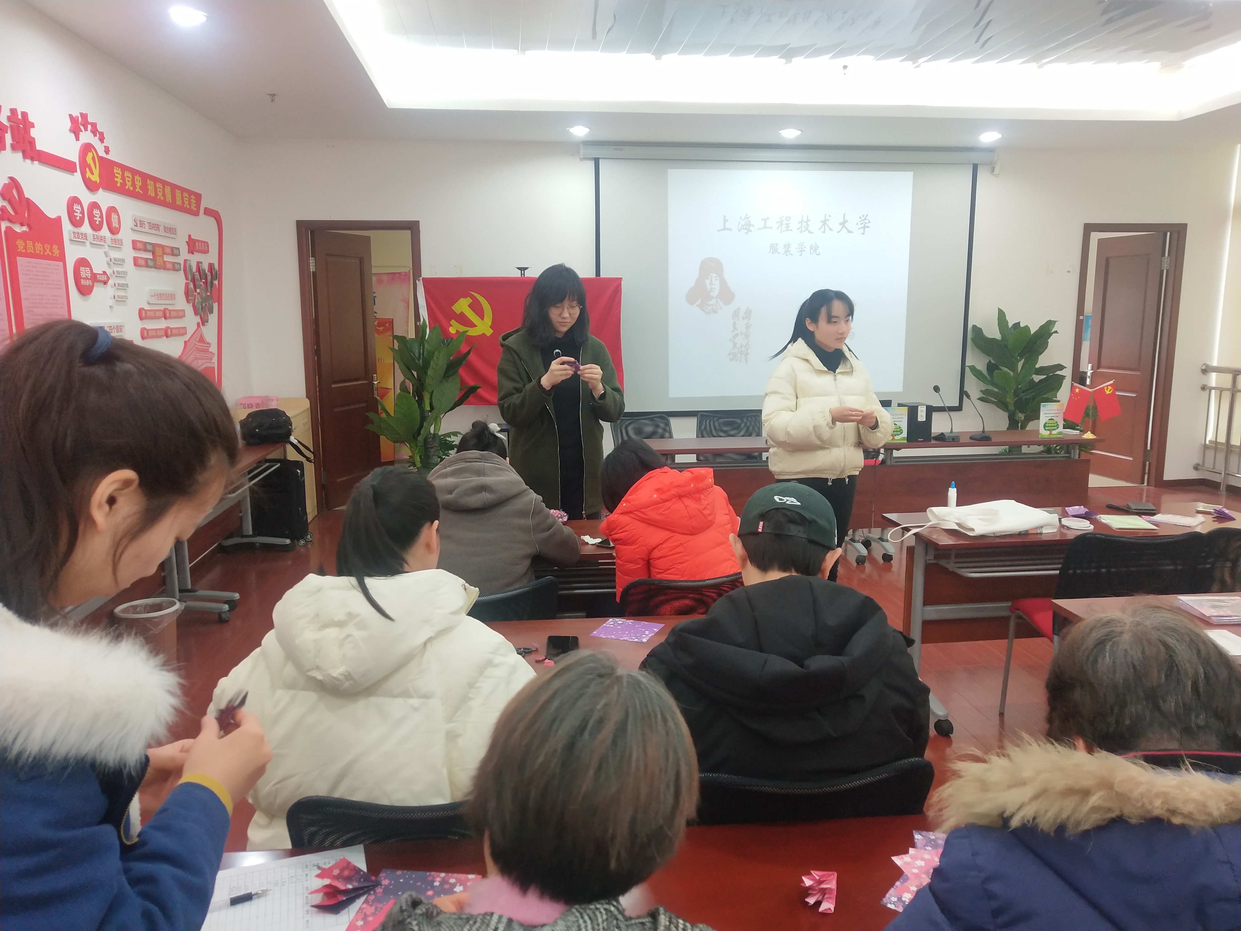 3月1日下午,服装学院学生第一、第二党支部学生党员以及团委科学商店学生代表一行来到学院科学商店服务点——佘山镇翠鑫苑社区举行“学雷锋,服务社区”手工制作活动,旨在将传统手工编织等技巧向社区居民普及。活动受到社区居民朋友的热烈欢迎。
