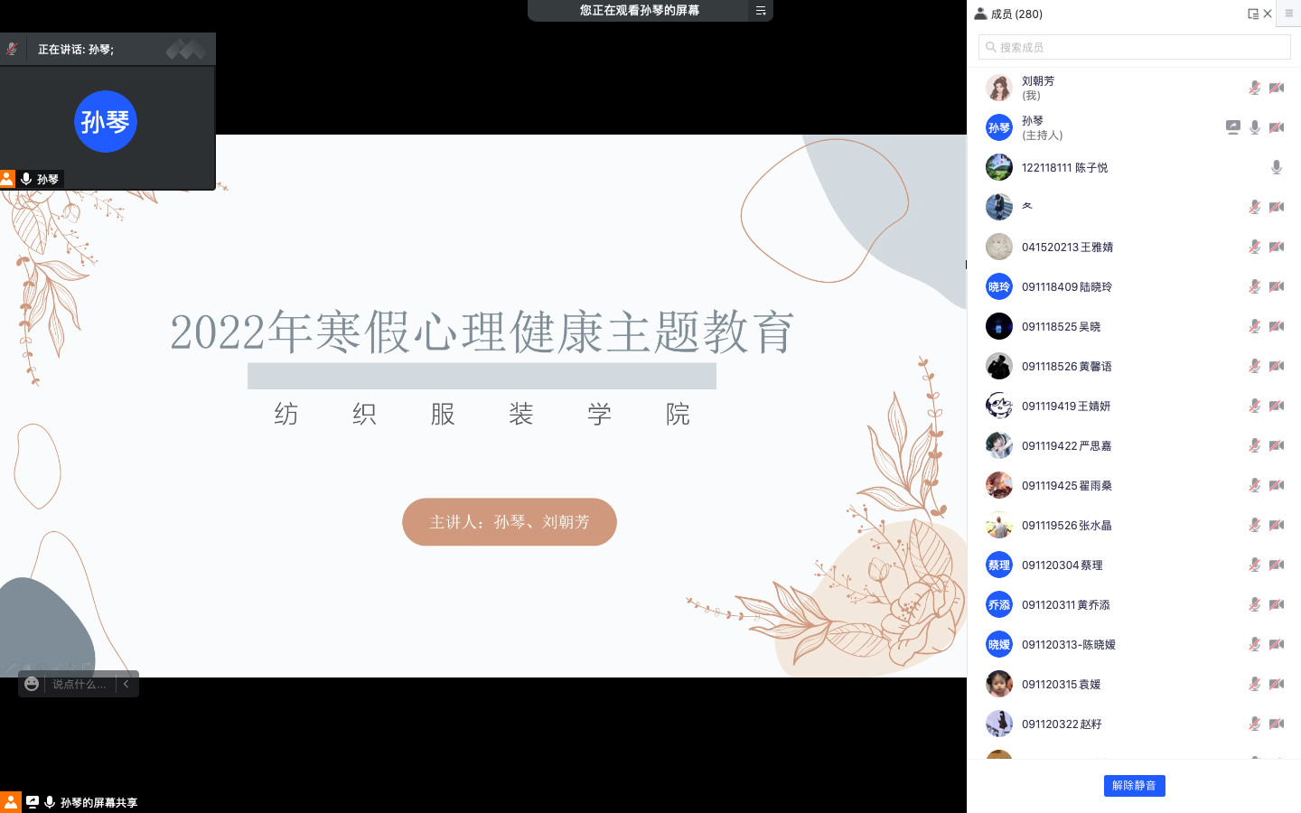 为了加强学生寒假安全教育工作,关注学生心理健康,稳步推进学院心理工作,太阳成集团tyc9728于1月23日下午,举行了2022年寒假心理健康教育线上活动。活动由心理辅导员孙琴老师主持,辅导员刘朝芳老师及学院全体学生参加。