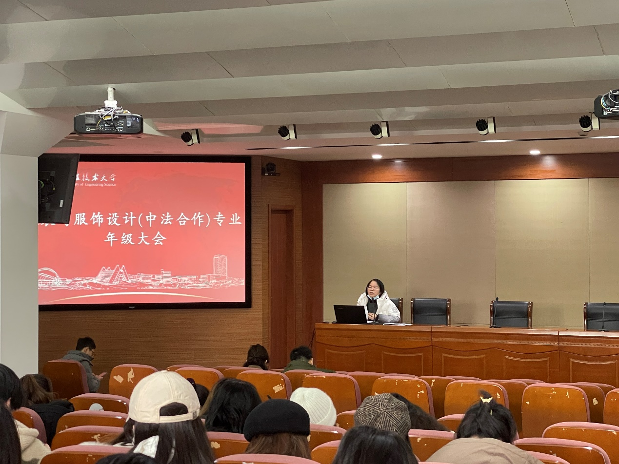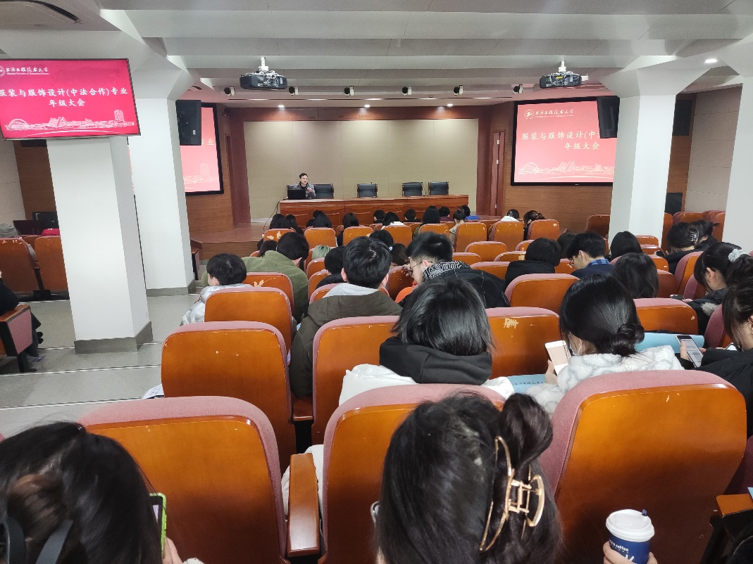 2月20日下午,服装与服饰设计(中法合作)专业年级大会在中法教学楼一楼报告厅顺利召开,系主任李春晓老师、各班班主任、辅导员以及各年级全体学生共同参加了本次年级大会。年级大会由辅导员李永贺主持。