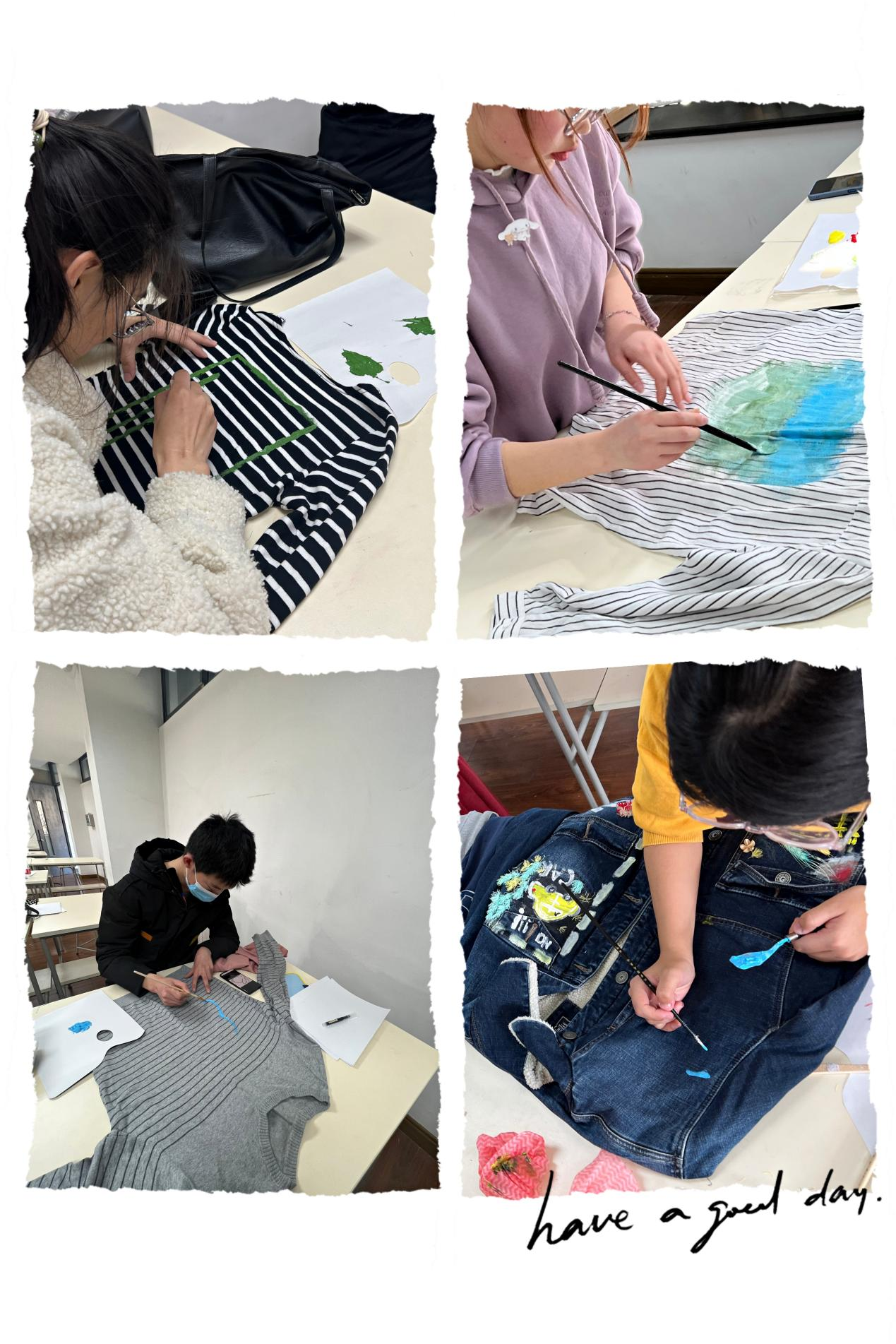 参与活动的成员们收集家中闲置衣物统一拿到了活动现场,依托平时所学专业知识,利用防水颜料、剪刀针线等改造闲置衣物,色彩和裁剪像春天给大地带来的生机,让旧衣物焕发新生。改造后的衣物虽非完美,但在活动的过程中,同学们感受到奉献精神趋使下劳动和艺术结合的魅力,期盼山区儿童收到衣物能感受到一份简单温暖和点滴爱心。