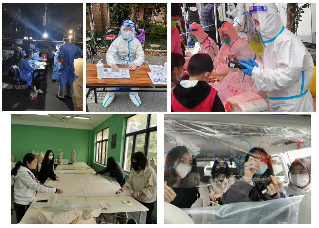 教师党员李春晓、董琳、董海宇、唐全、魏晓静等主动报名担任所在小区志愿者,协助社区开展排查和信息登记工作、发放抗原检测试剂盒、维护社区秩序、担任线上楼组长传递居委会工作安排并安抚居民情绪等工作,积极服务群众,做好了表率作用。李春晓老师所住小区为老小区,老年居民较多,她连续两个下午专门指导老年居民进行核酸登记,并用自己手机帮助三十余位老年同志登记核酸检测码;此外,李老师还充分发挥中法系师生专业优势,积极参与到长宁校区防疫隔离车内部隔离改造的工作中,在确保学校车辆不受任何破坏前提下,结合车顶的针织布特点,设计组采用立裁珠针固定法将材料牢固地固定在车顶,并利用车门的密封条和门把手结构固定隔离膜的侧边,实现了驾驶位置与乘坐人员的车厢的隔离。