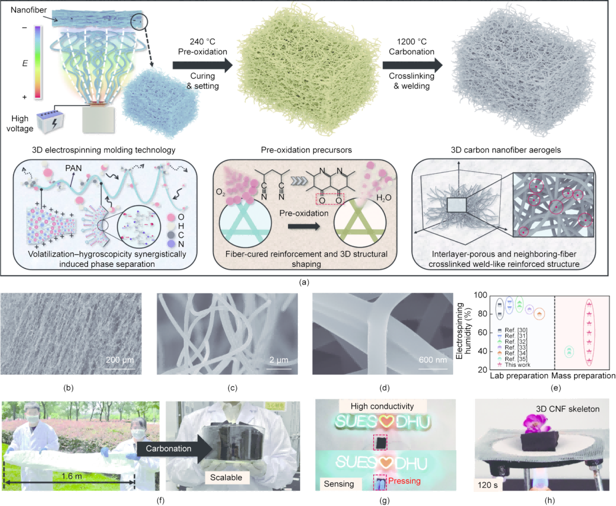 面对深空探测技术中极端环境材料“脆性大、结构易塌陷”的难题,我校团队另辟蹊径,创新提出了“挥发-吸湿协同诱导相分离”3D静电纺丝成型技术 。通过构建独特的“焊接增强结构”,成功研发出一种兼具超轻、超弹及耐极端温度特性的碳纳米纤维气凝胶(CNFAs) 。