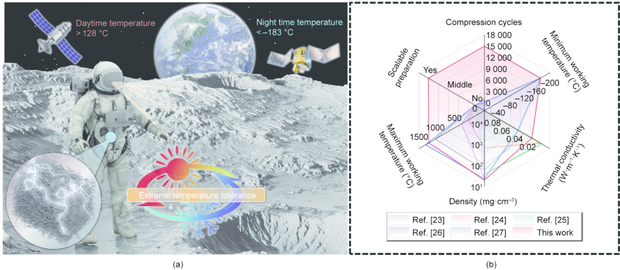 该成果不仅实现了低成本的规模化制备,更验证了其在宇航员生命体征监测、智能宇航服隔热以及外太空探索等领域的巨大应用潜力,为我校在航空航天特种防护装备领域的研究提供了新的理论支撑与技术方案 。