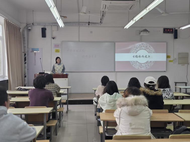 分享环节中,齐晓雯同学从《范进中举》这个经典故事引入,简单介绍了《儒林外史》的作者简介,创作背景,结构简介与主题思想。通过对基本情况的解读,使同学们更好地了解其故事内容。齐晓雯同学将主要人物进行分类剖析,给予自己的解读,同时从人物出发分享与其相关的人物故事。在她的分享里,同学们不仅读懂了书中鲜活的人物群像,更体会到作者对人生社会的深刻探索,以及对知识分子出路的叩问与思考。