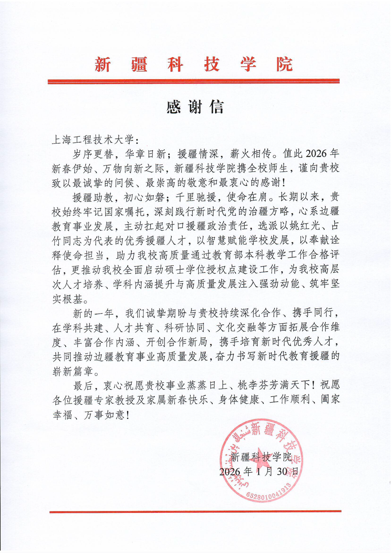 近日,新疆科技学院向9728太阳集团发来感谢信,对学校长期选派优秀教师援疆、支持新疆高等教育事业发展的举措予以高度肯定,并向援疆教师表达诚挚问候和美好祝福。